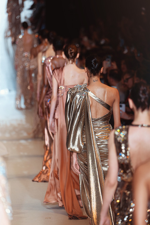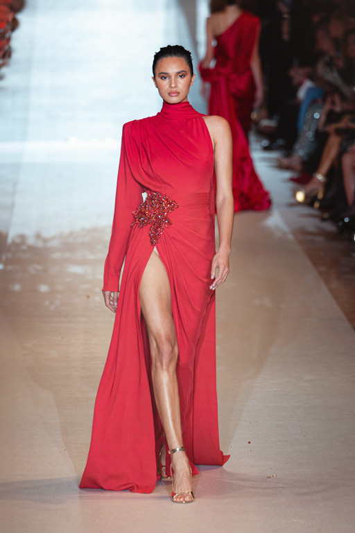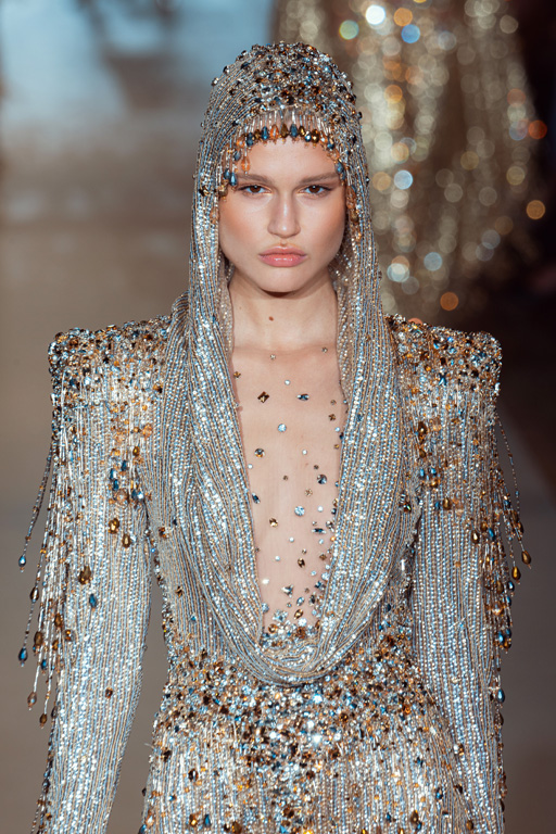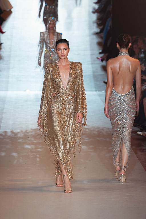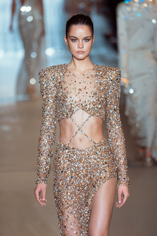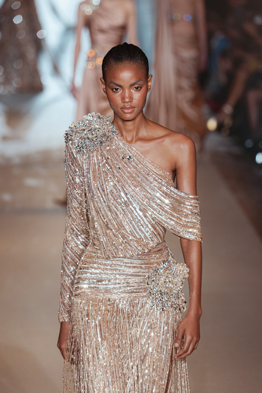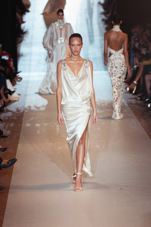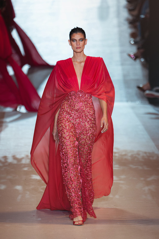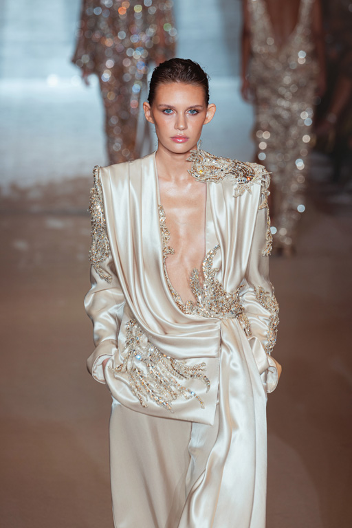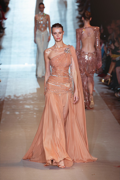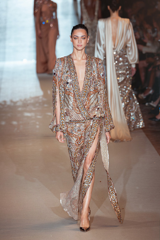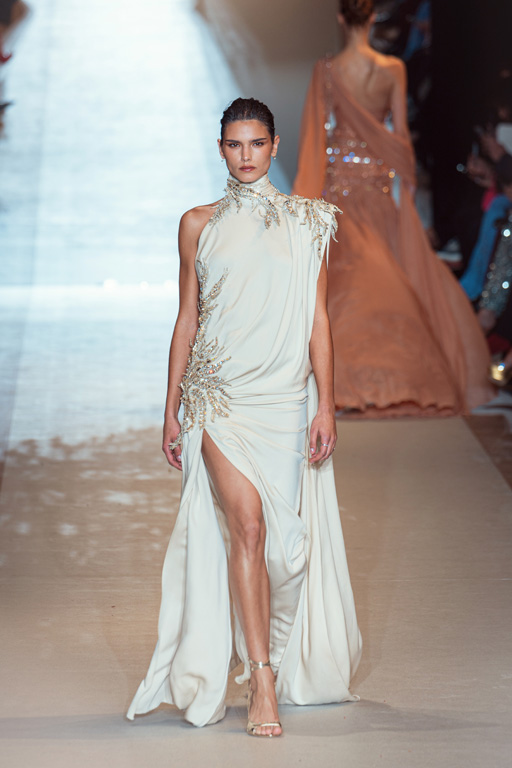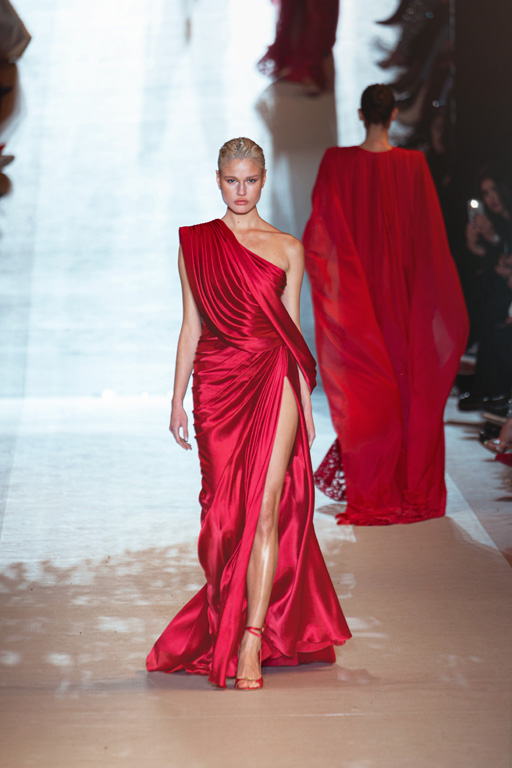 Zuhair Murad‘s couture collection A TYRIAN ARABESQUE pays homage to the Phoenicians’ love for the sea, merging ancient and modern elements. The designs evoke the sensuality and craftsmanship of the ancient seafaring people, with strong female figures like goddesses lending their radiance to the collection.
