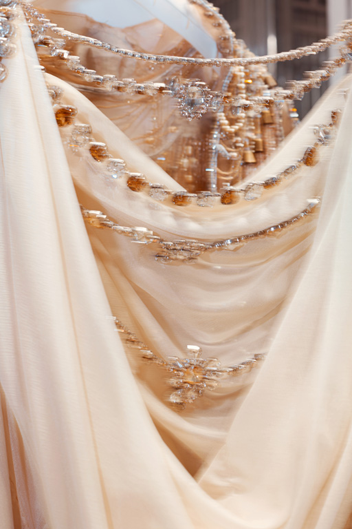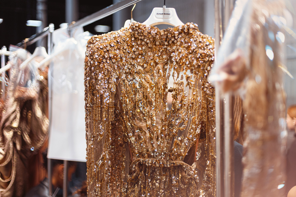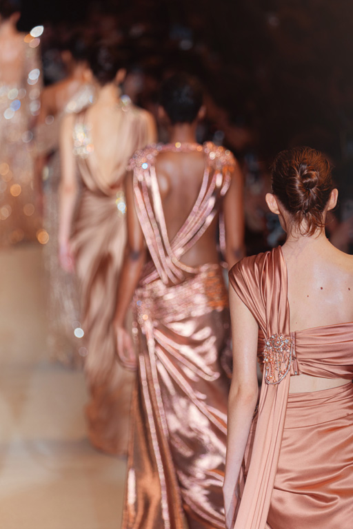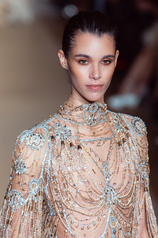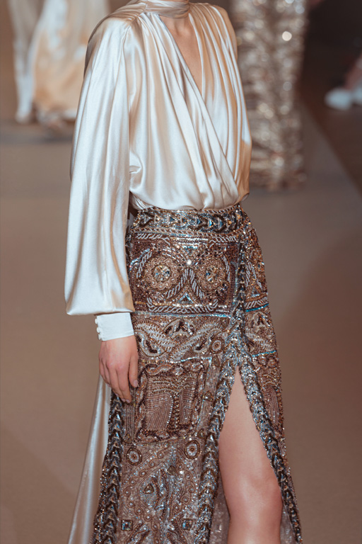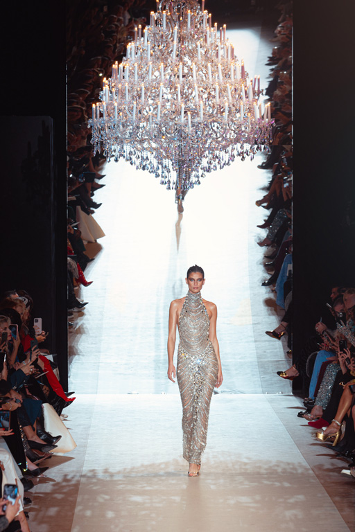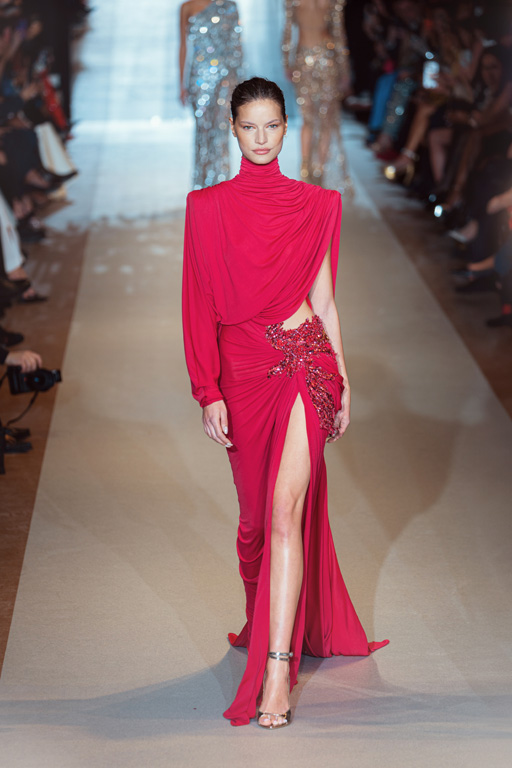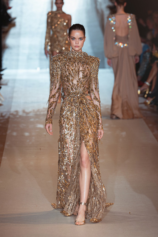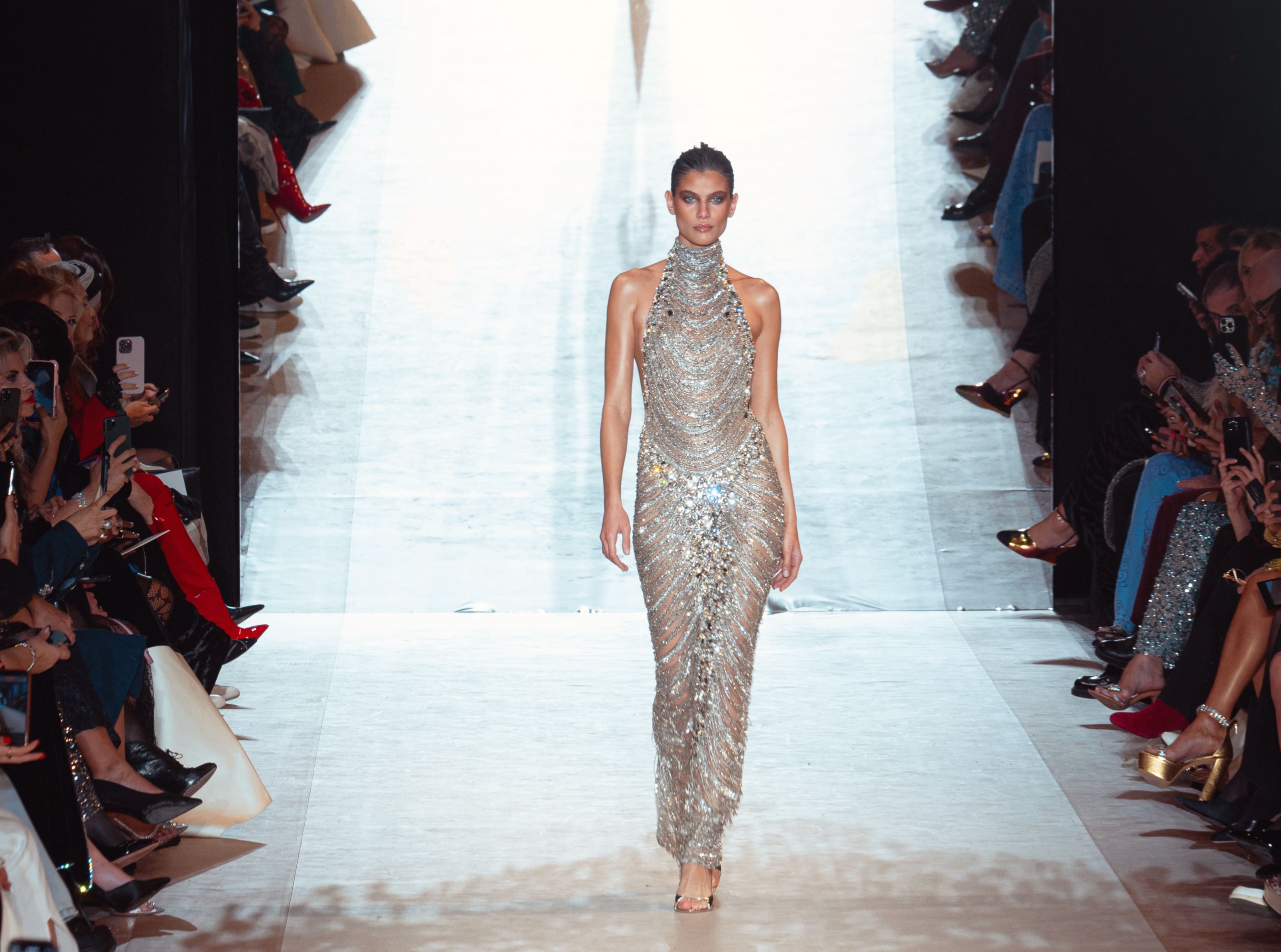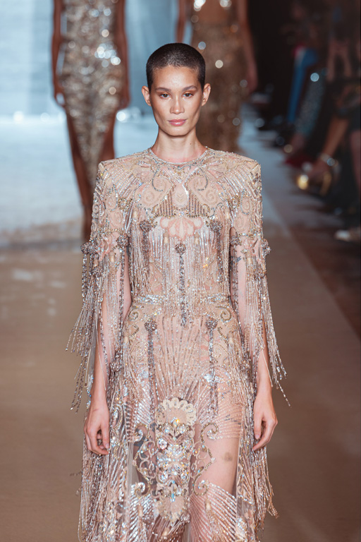 Zuhair Murad‘s couture collection A TYRIAN ARABESQUE pays homage to the Phoenicians’ love for the sea, merging ancient and modern elements. The designs evoke the sensuality and craftsmanship of the ancient seafaring people, with strong female figures like goddesses lending their radiance to the collection.