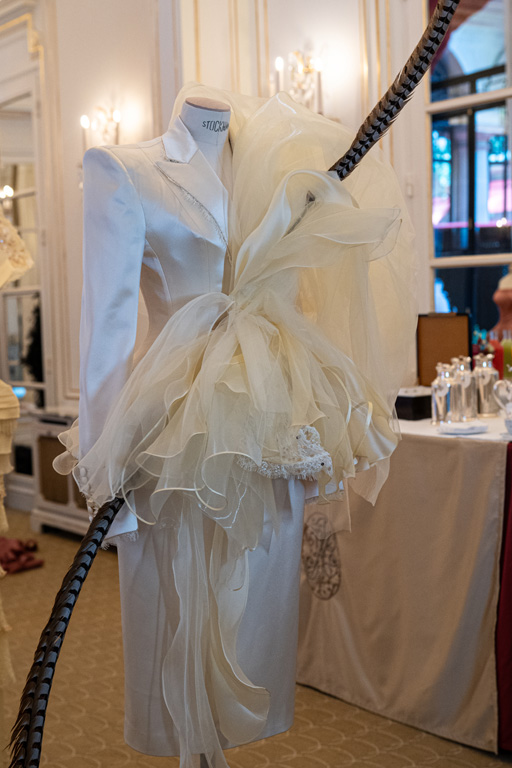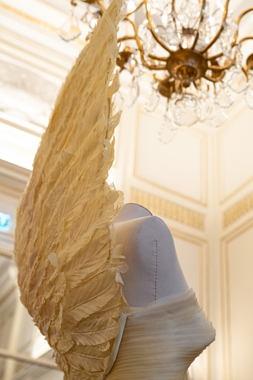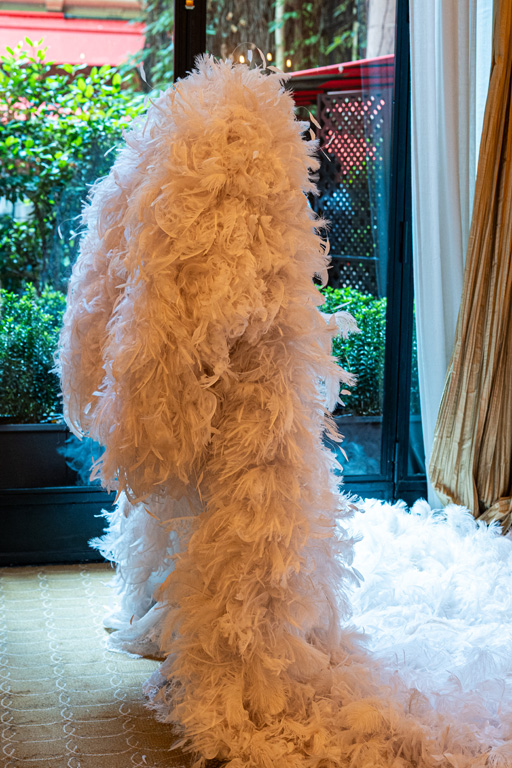 It begins with “Birth,” showcasing feather-fringed capes and lace with embryo motifs that symbolize the fragility of life.