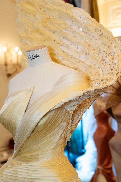 The “Dance” segment features 3D tailoring and modular suits that capture movement, while “Soar” draws inspiration from the canary’s flight, using metal-coiled structures and cloud-embroidered hems to evoke freedom.