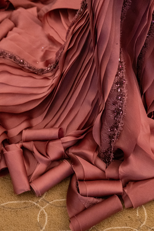 In “Indulgence,” lustrous fabrics and deconstructed floral lace embody sensuality.
