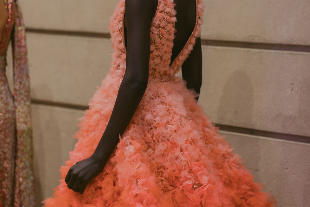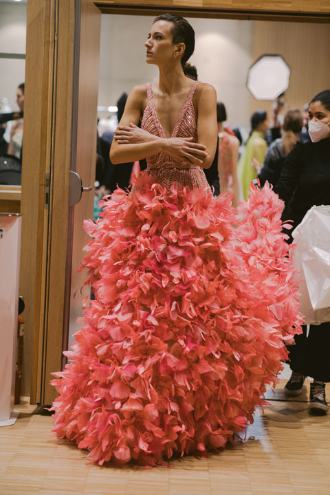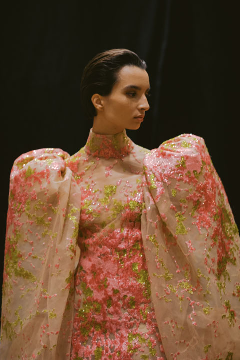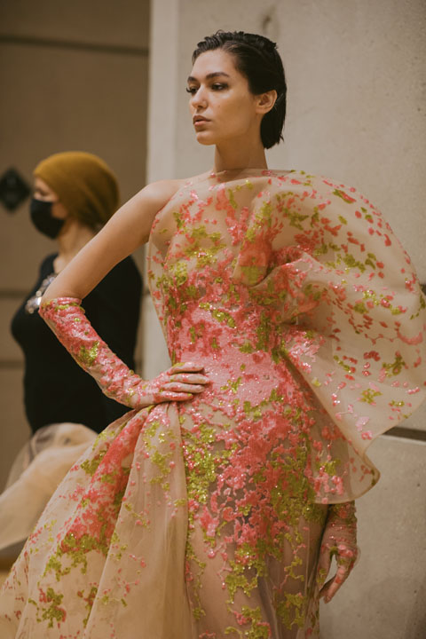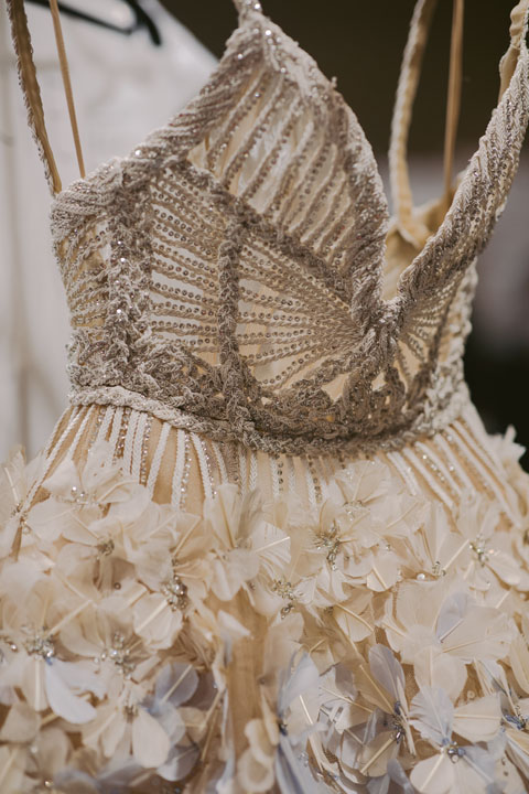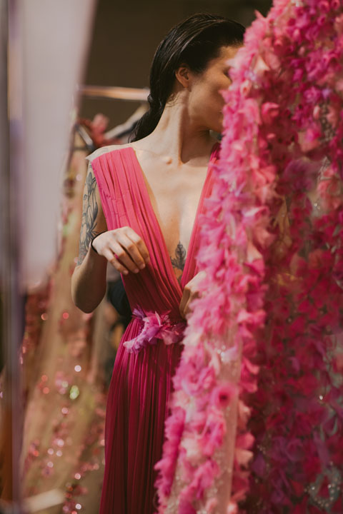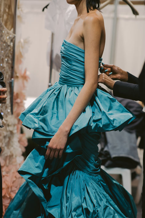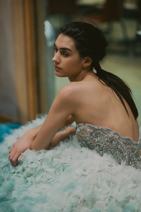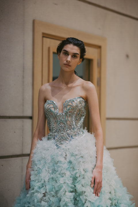 A bright spectrum of colors splash across a panorama of silhouettes that take us on a marvelous journey. Gradients of capacious feathered ballgowns capture the magic of the in between moments of dusk and dawn, as the sun tints the skyline in celestial blues and sea green. Shimmery sequins and crystals embellish the tulle of night, guiding the exploration across a vast geography of plunging necklines and mermaid tails. Layers of fuchsia, blush and chartreuse taffeta explode into large off-the-shoulder rose petals and peony bouquets that exaggerate organic feminine curves.