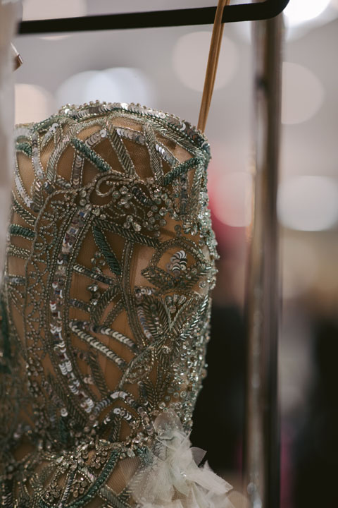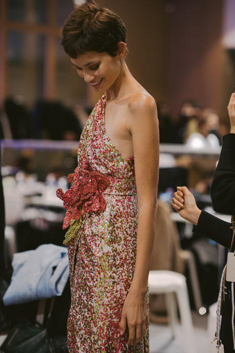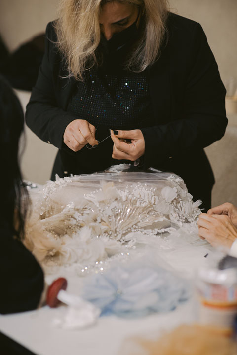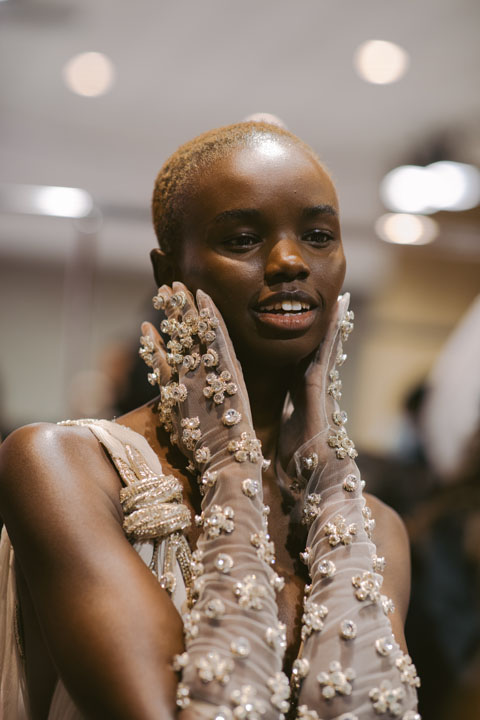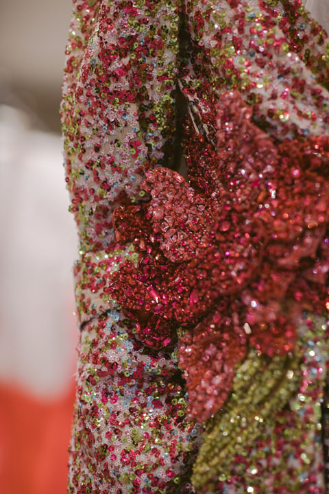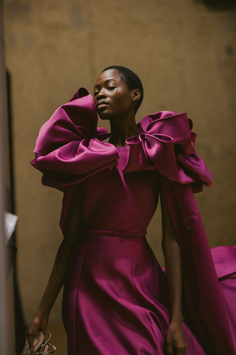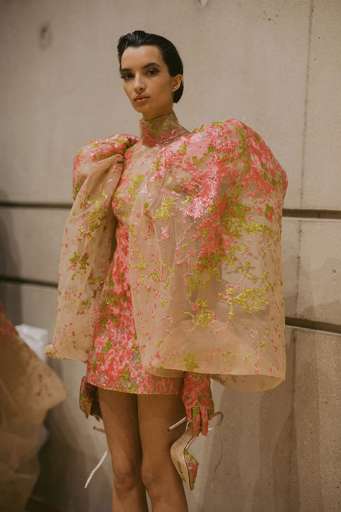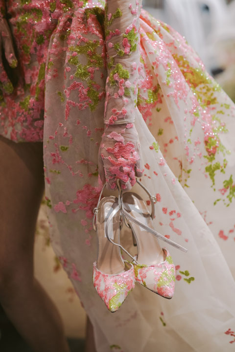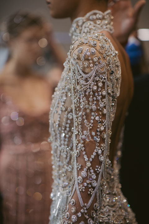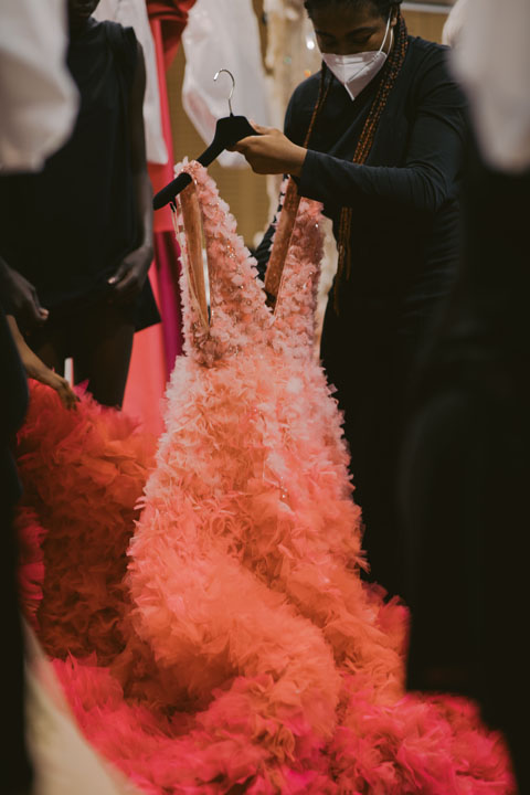 A bright spectrum of colors splash across a panorama of silhouettes that take us on a marvelous journey. Gradients of capacious feathered ballgowns capture the magic of the in between moments of dusk and dawn, as the sun tints the skyline in celestial blues and sea green. Shimmery sequins and crystals embellish the tulle of night, guiding the exploration across a vast geography of plunging necklines and mermaid tails. Layers of fuchsia, blush and chartreuse taffeta explode into large off-the-shoulder rose petals and peony bouquets that exaggerate organic feminine curves.