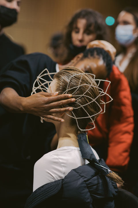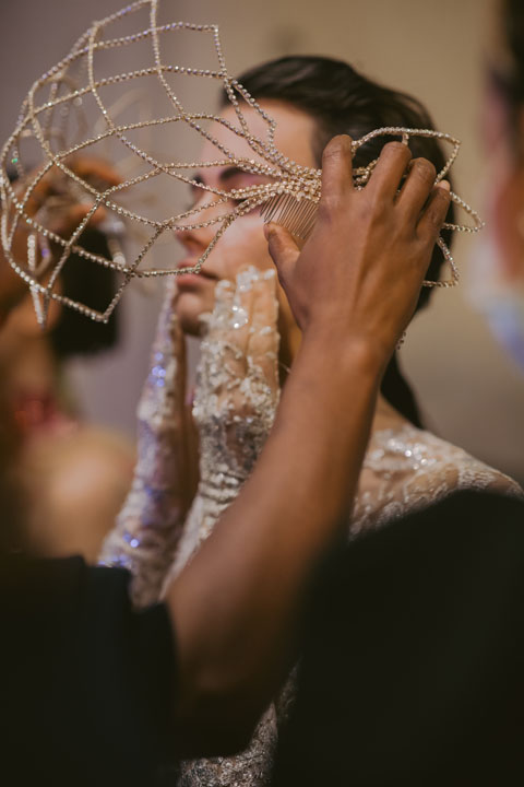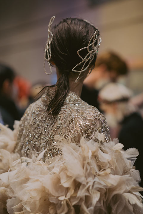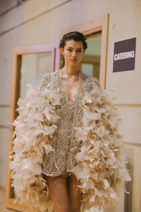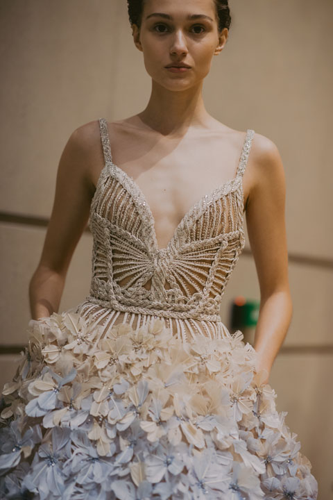 Threads of silk are braided into intricate patterns that move across the body in geometrical arabesque-like curves. As the final destination draws near, the divine pearl white bride, enrapturing in feathers, floats in on a mist of organza and tulle billowing from below. This collection is a voyage through an earthly garden of heavenly delight. The terrestrial paradise, EDEN ON EARTH, is a reminder that we are not only always surrounded by divinity, we are created of it.