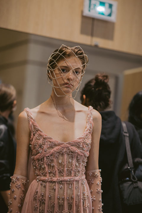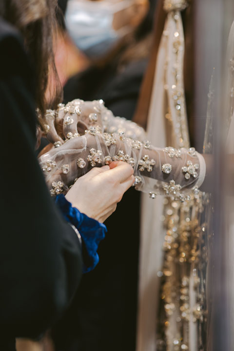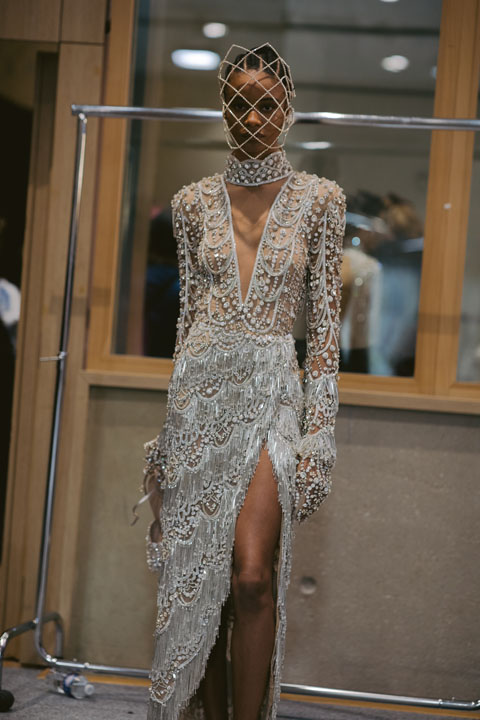 Each passage of this escapade through geographies and time are made unique through generous textures and distinct organic forms. Strong structured shoulders like colonnades of ancient temples, plummet into billowing trains of ivory and greige. Sleeves continue into graceful gloves embroidered in a sun-kissed, sparkling sea of aquas and mints usher us forward, while tassels and fringe swish and sway to myths of the Greeks and Romans.