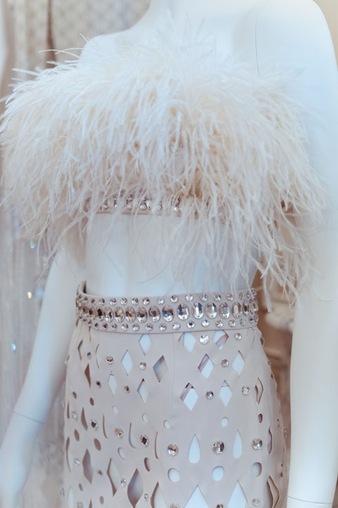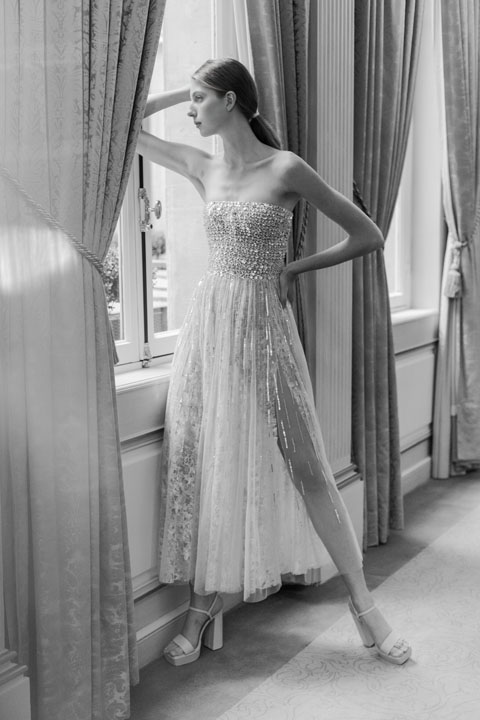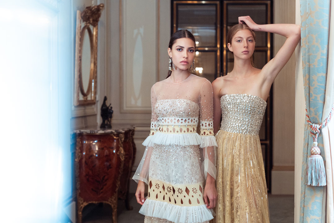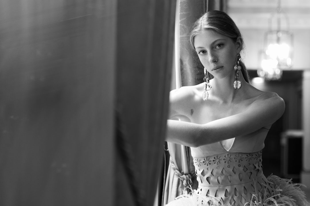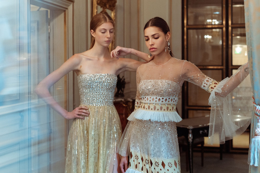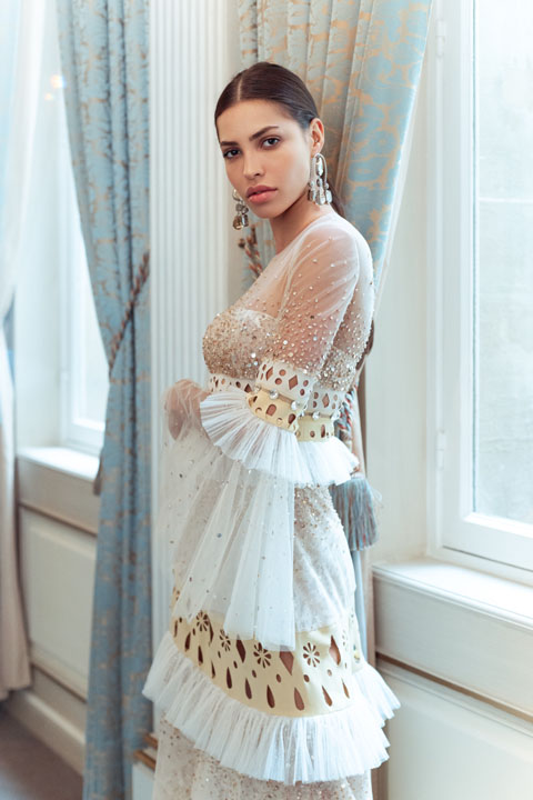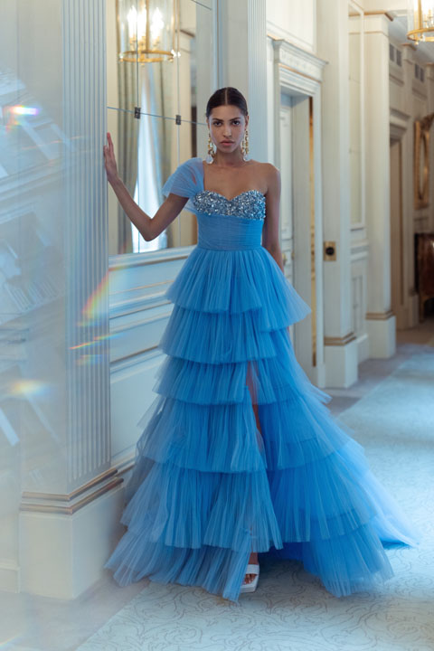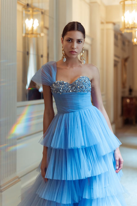 The majestic charm of petals with pink reflections like a summer dawn, with blue sparkles like a spring azure, with green nuances like a velvety nature, distills its promises of bucolic escapes on angelic transparencies embroidered with the iridescent reflections of the sun. Sometimes the precious flower shines on a deep and voluptuous night. The knots, pleats, ruffles, patterns, attesting to the know-how of the Mason’s workshops, enliven the refinement of these outfits designed for modern goddesses.