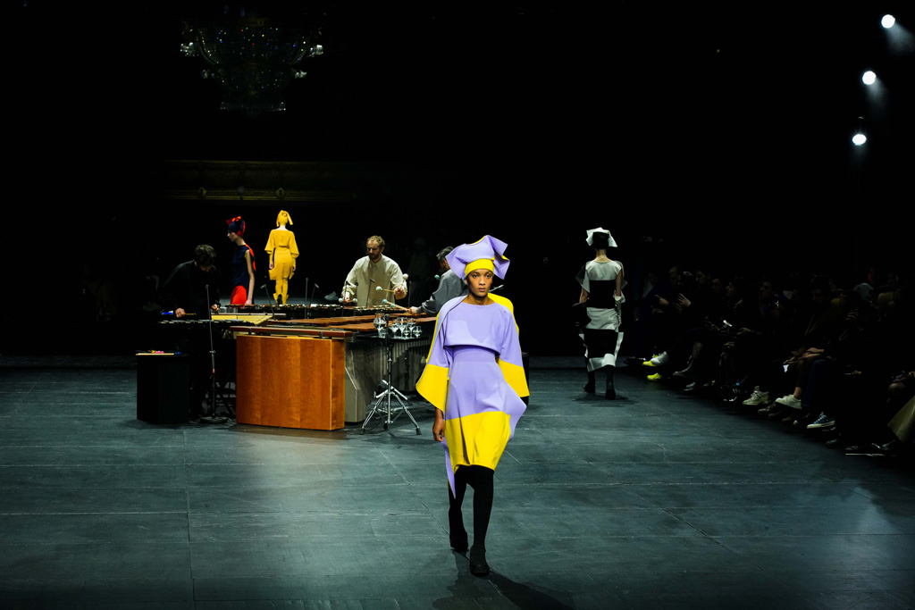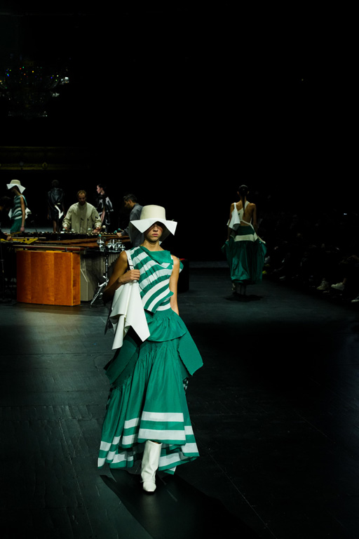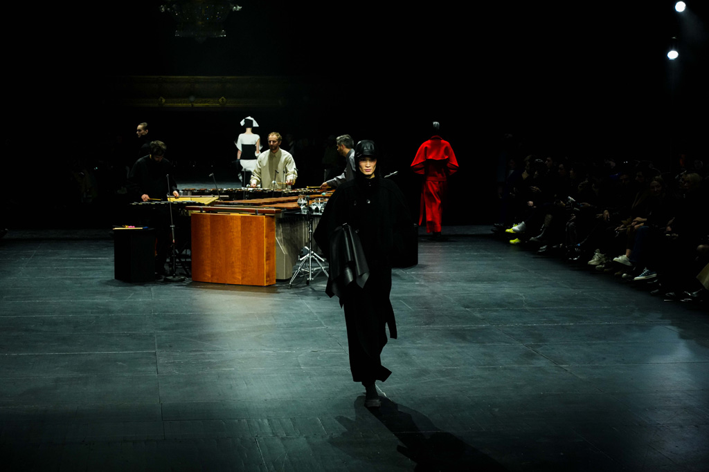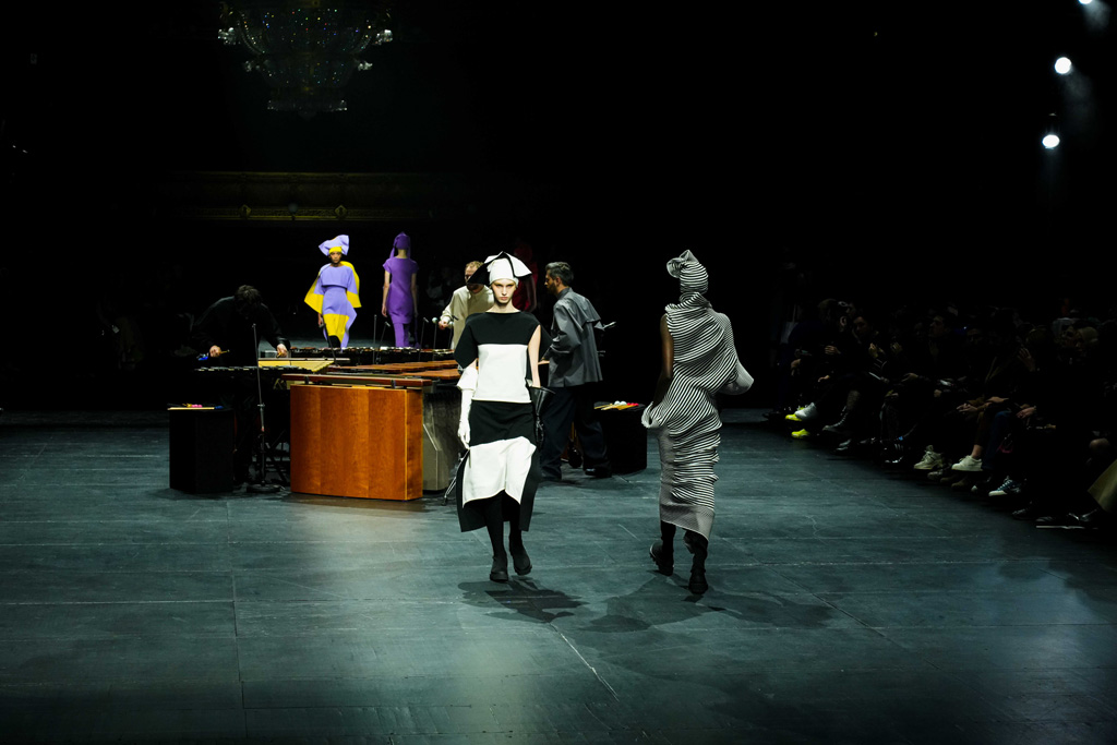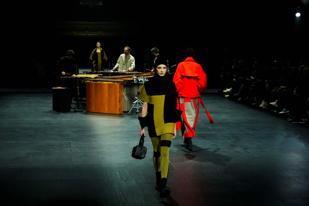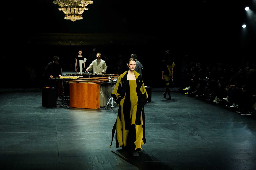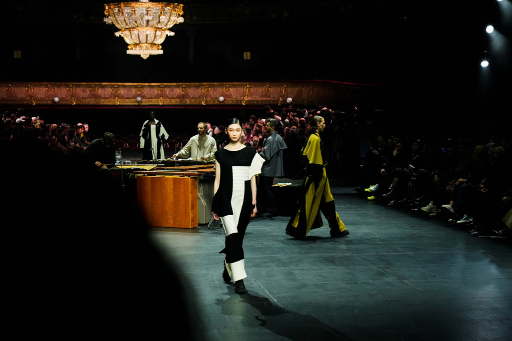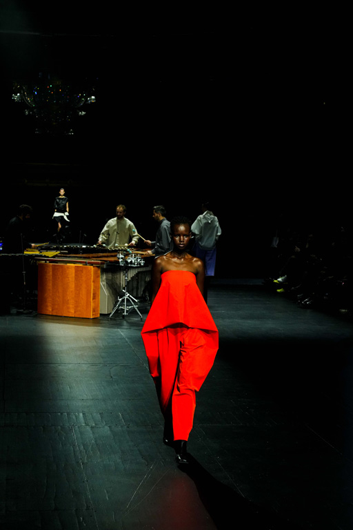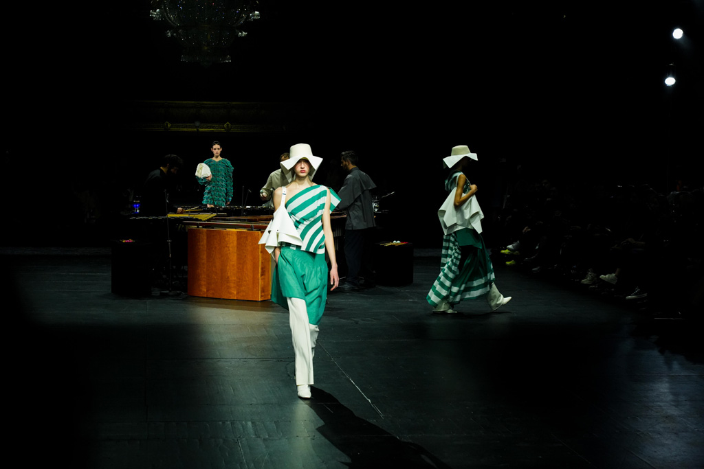 Taking place on the stage of the theater, the show began with a live marimba performance by percussion ensemble Trio SR9. The tense atmosphere onstage lifted as the percussion session continued. Models in looks inspired by transformed squares walked on paths defined by light, towards a finale against the backdrop of the empty opera house.