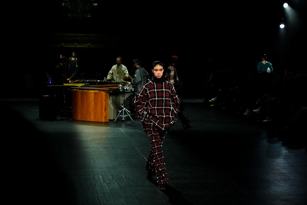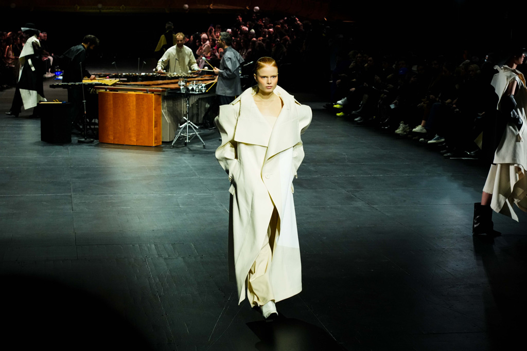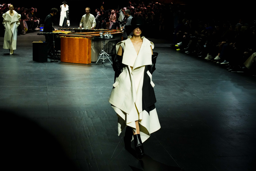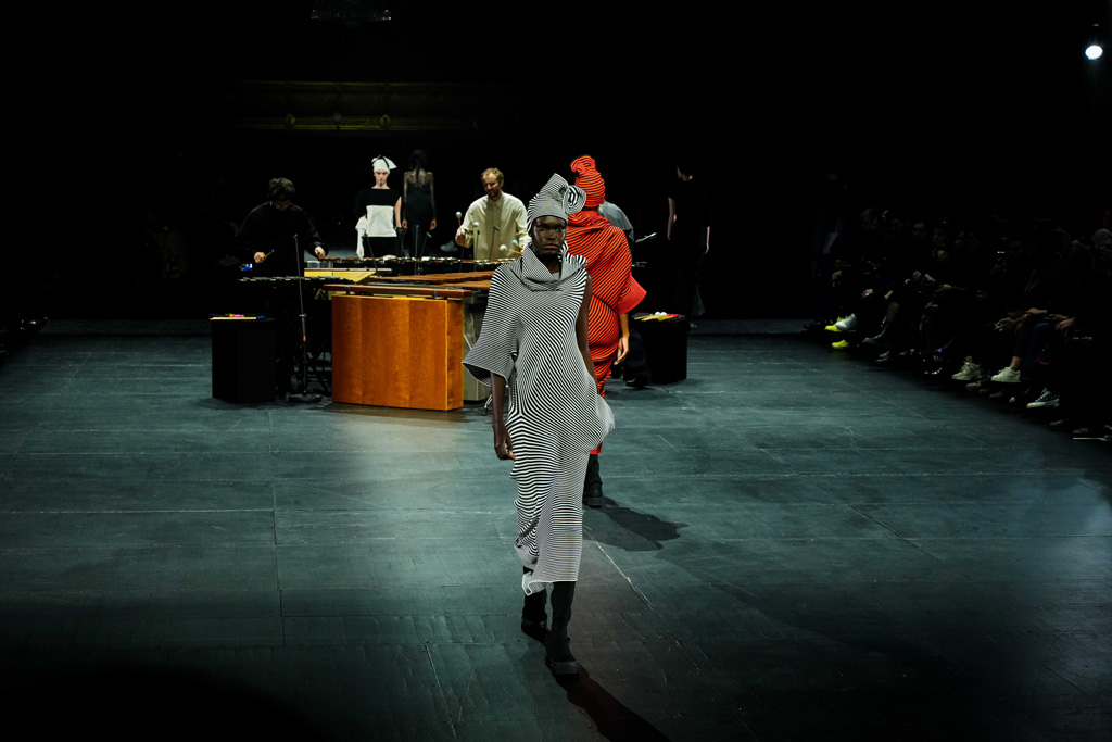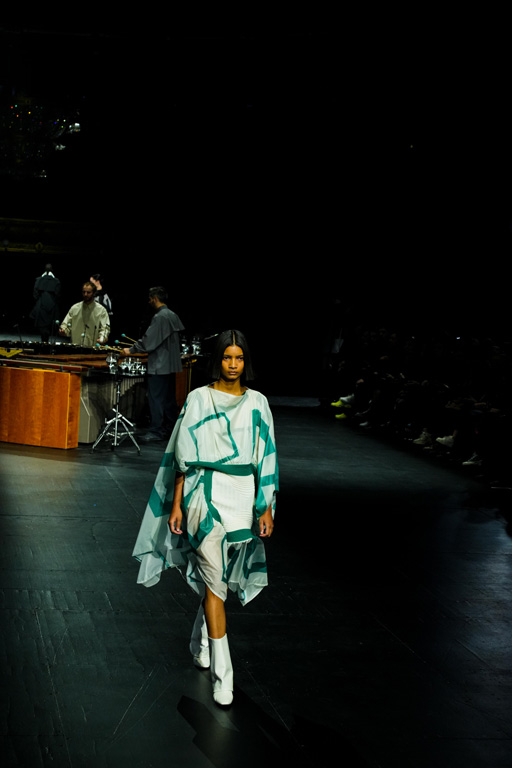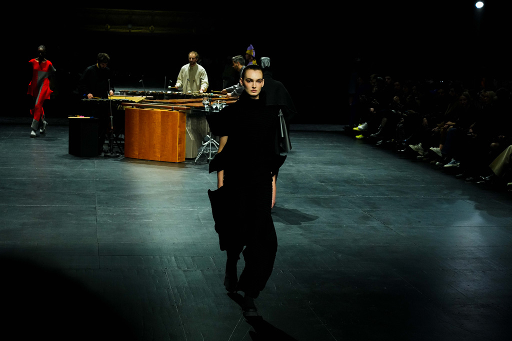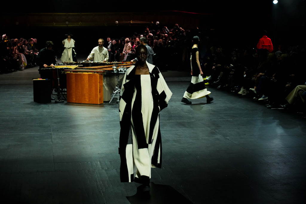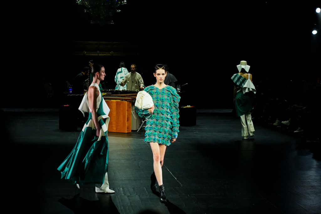 Taking place on the stage of the theater, the show began with a live marimba performance by percussion ensemble Trio SR9. The tense atmosphere onstage lifted as the percussion session continued. Models in looks inspired by transformed squares walked on paths defined by light, towards a finale against the backdrop of the empty opera house.