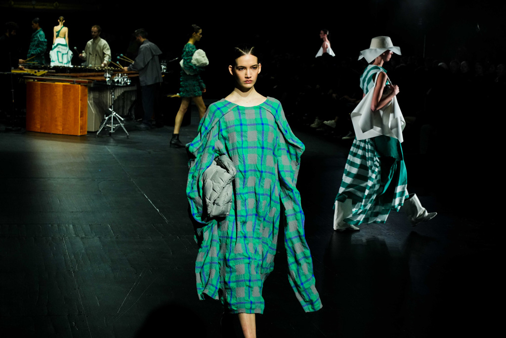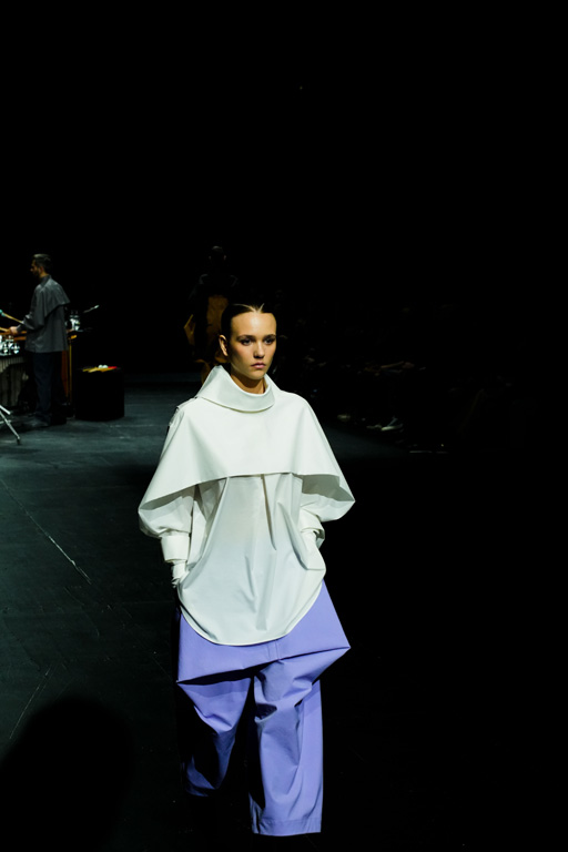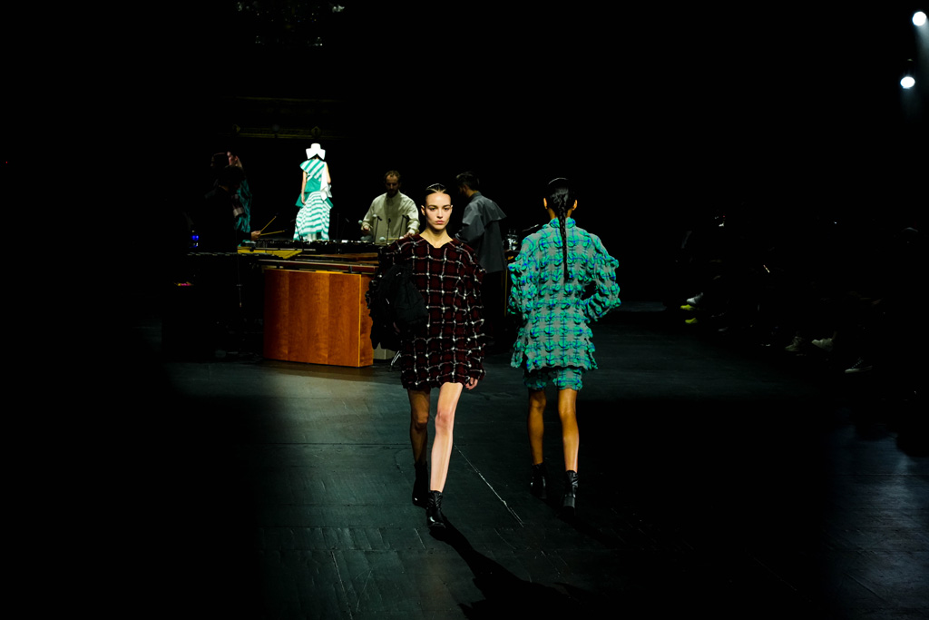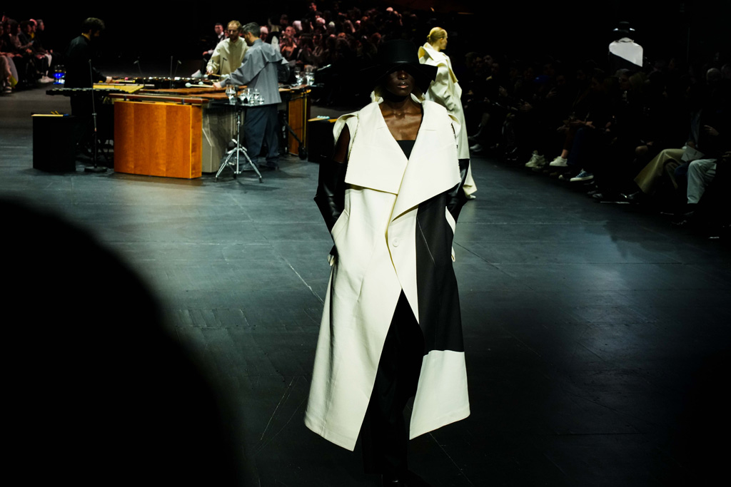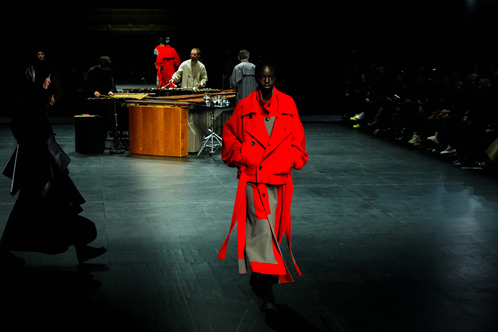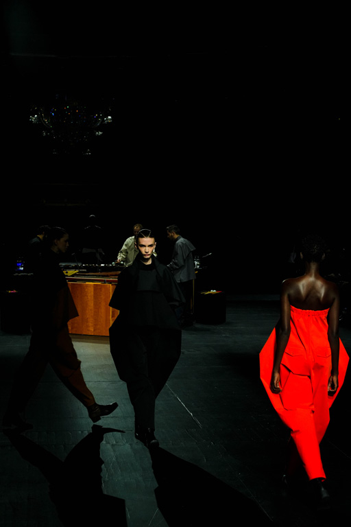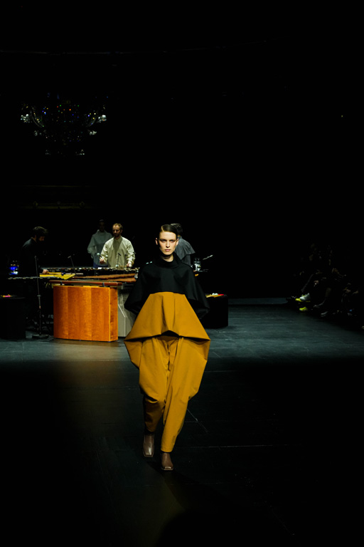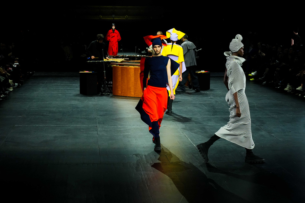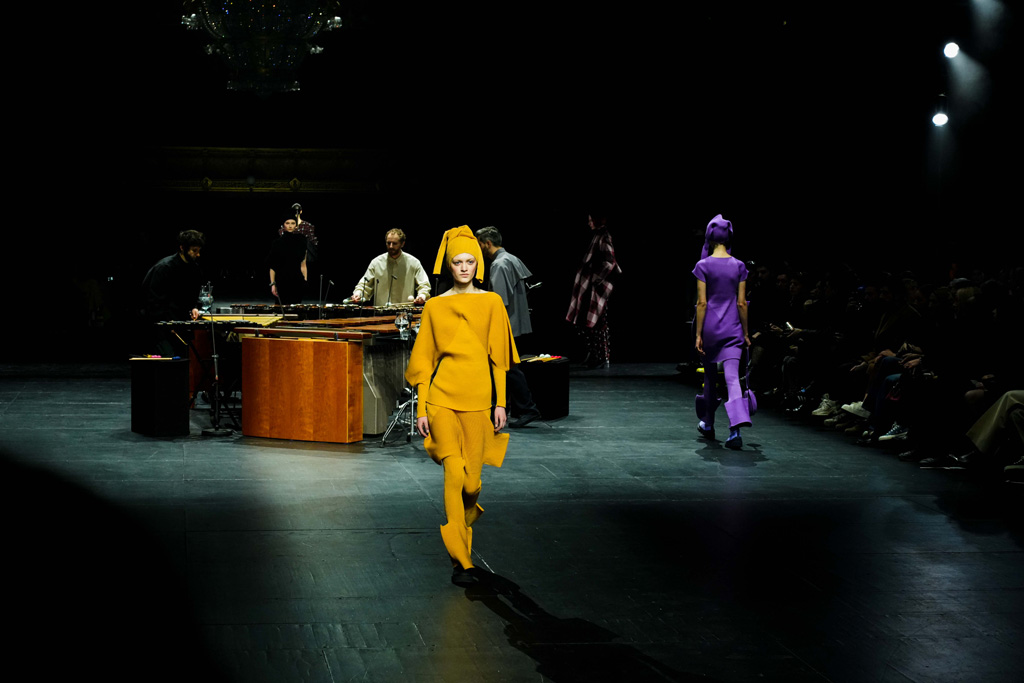 Taking place on the stage of the theater, the show began with a live marimba performance by percussion ensemble Trio SR9. The tense atmosphere onstage lifted as the percussion session continued. Models in looks inspired by transformed squares walked on paths defined by light, towards a finale against the backdrop of the empty opera house.