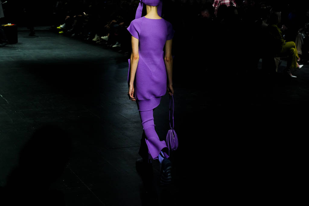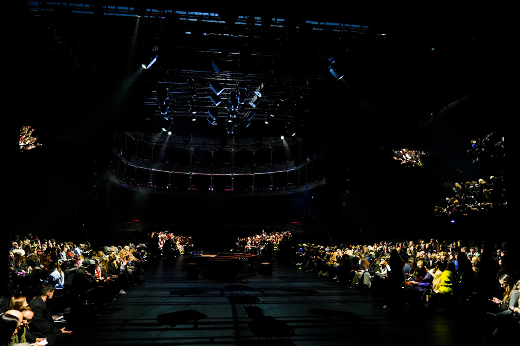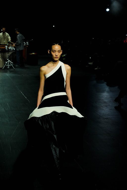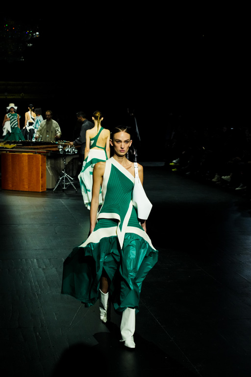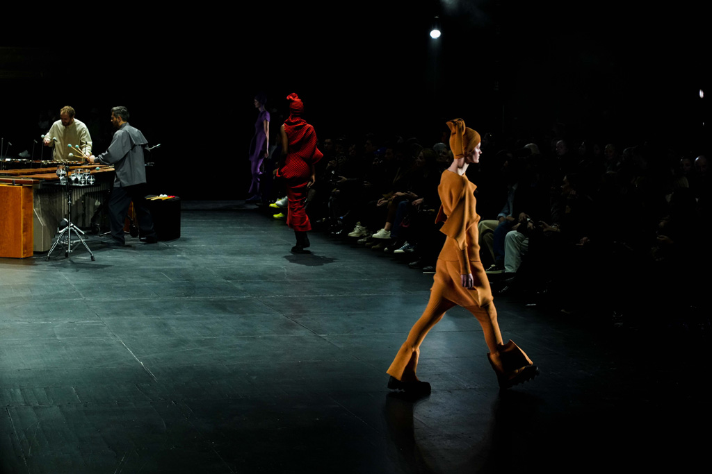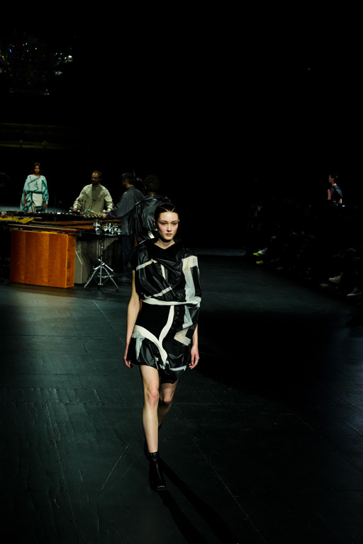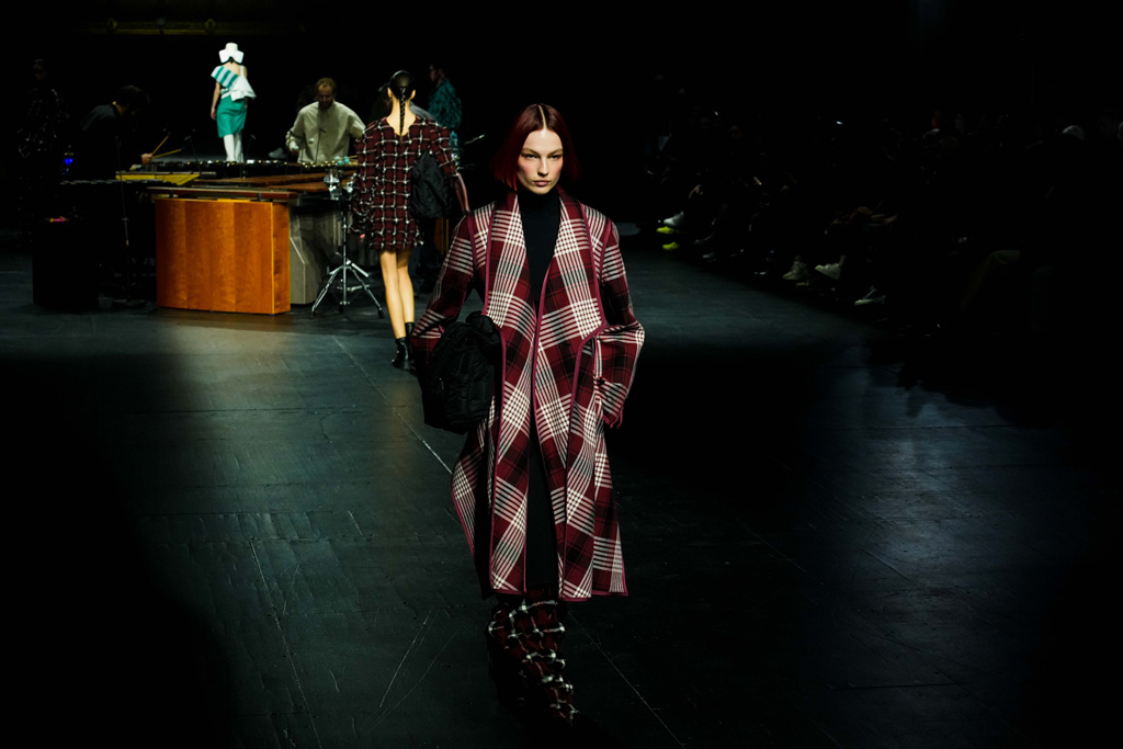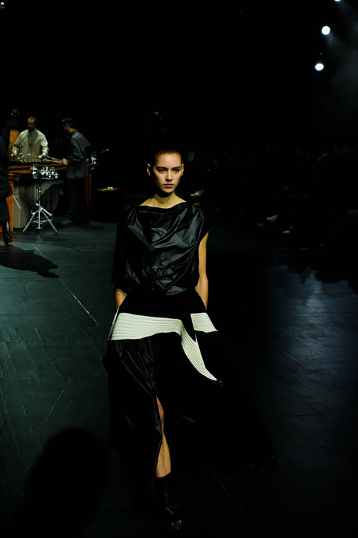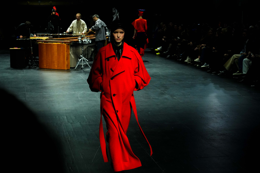 Taking place on the stage of the theater, the show began with a live marimba performance by percussion ensemble Trio SR9. The tense atmosphere onstage lifted as the percussion session continued. Models in looks inspired by transformed squares walked on paths defined by light, towards a finale against the backdrop of the empty opera house.