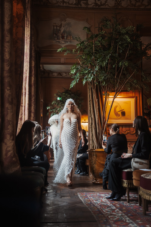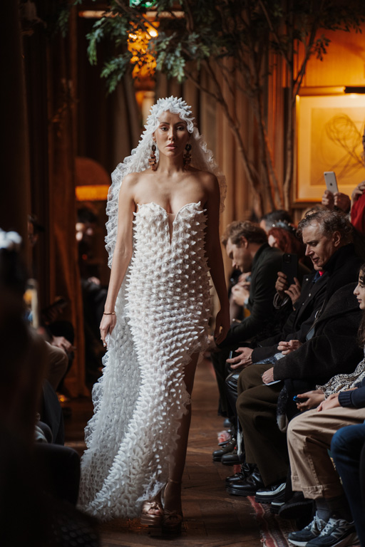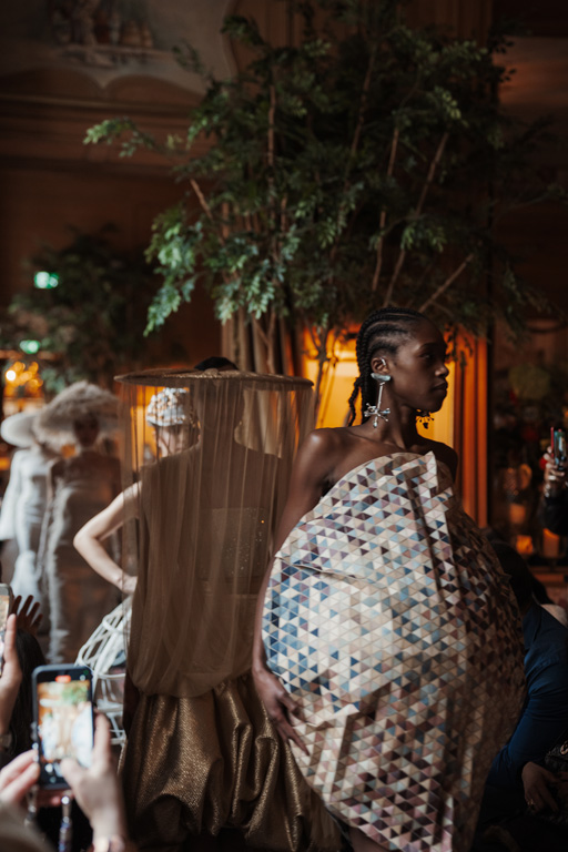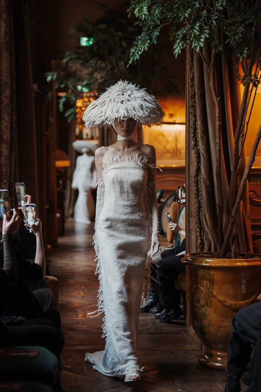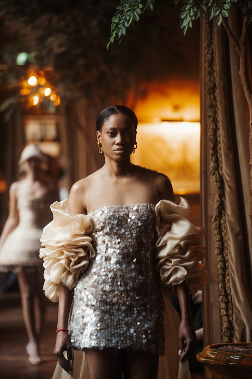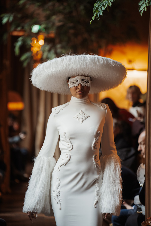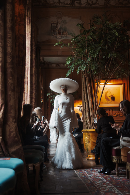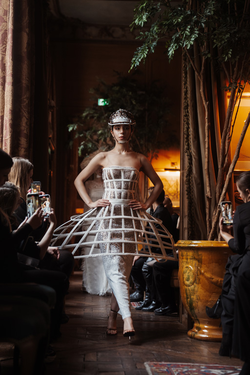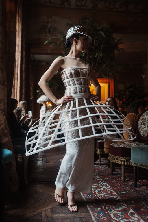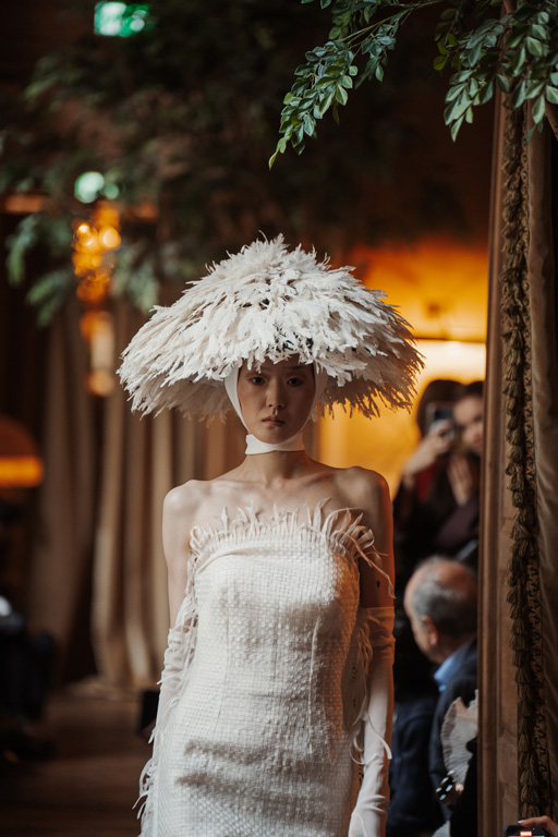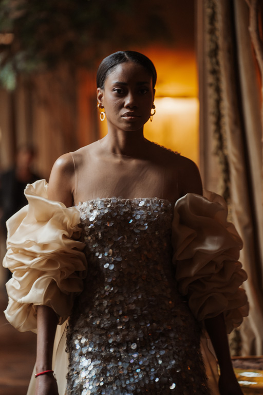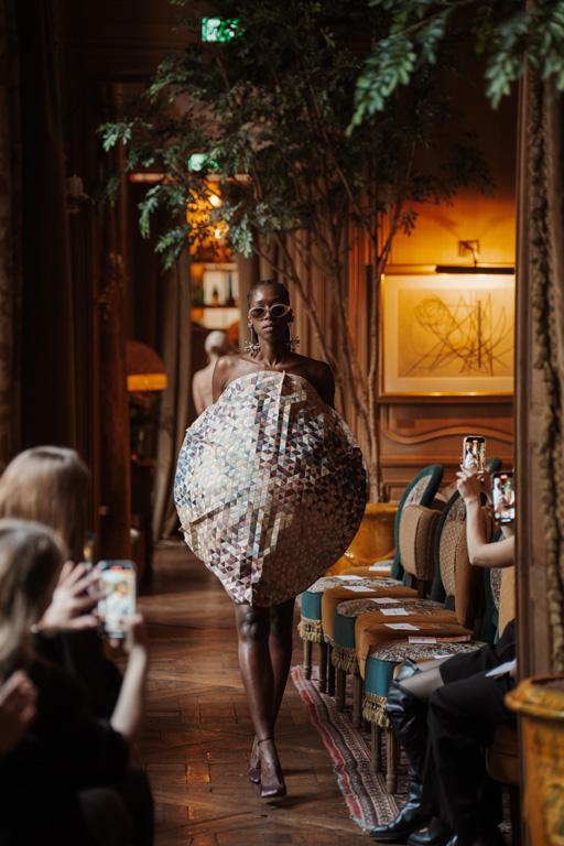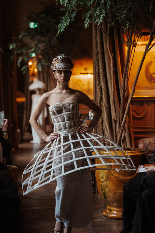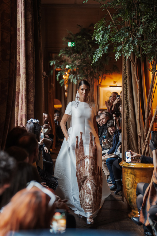 “ARCHIVES” tributes to architecture, decorative arts and materiality, reinterpreted through sculptural volumes, precisely cut patterns and a meticulous selection of ornamental details. The collection incorporates materials and accessories from the field of architecture, masterfully adapted to Haute Couture, subtly fusing both disciplines in an exercise of innovation and refinement. The set design, devised by Mariano Moreno for his Paris debut, is based on archive images of the first Haute Couture fashion shows. With an atmosphere of constructive nostalgia, the set design evokes the fantasy and timeless elegance of fashion, celebrating the looks of the “ARCHIVES” collection in perfect harmony between past and present.