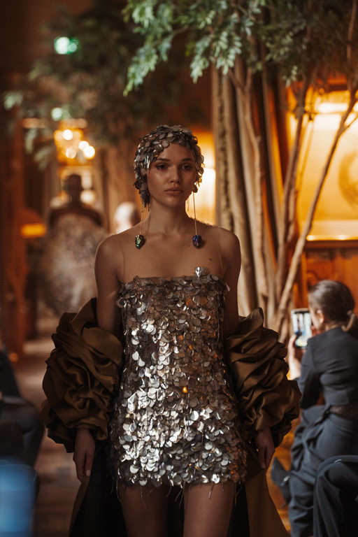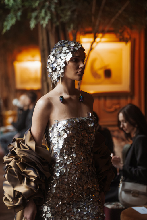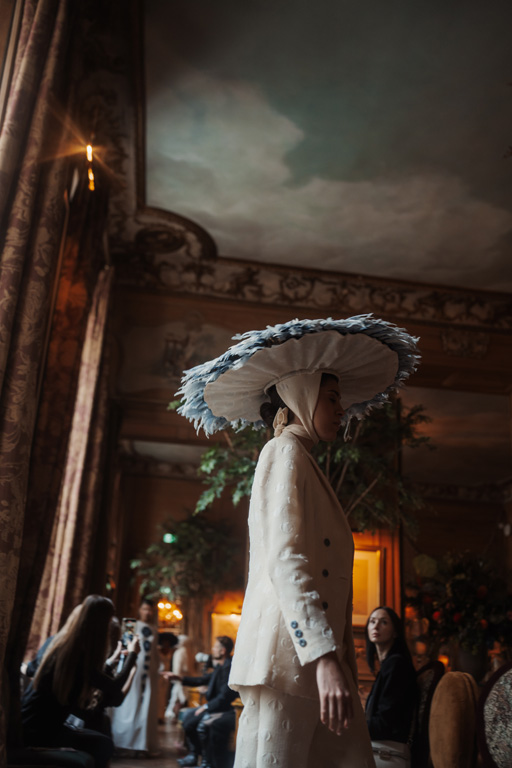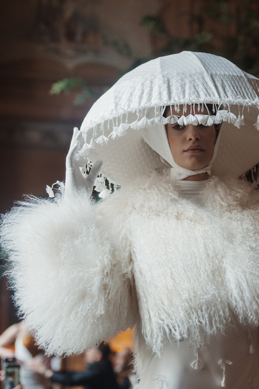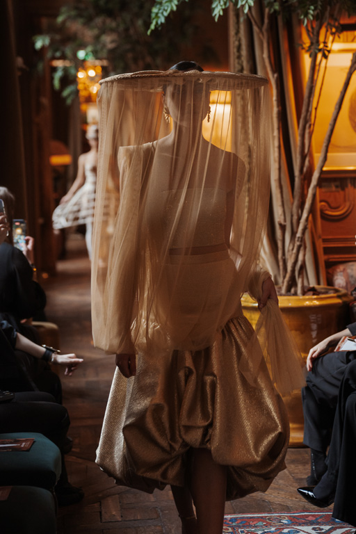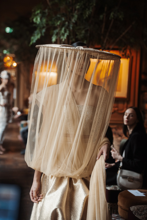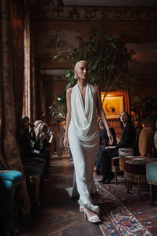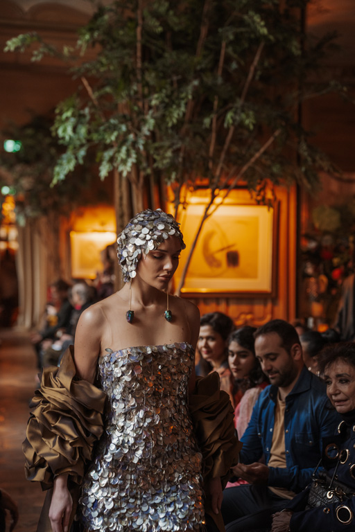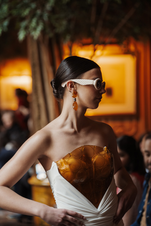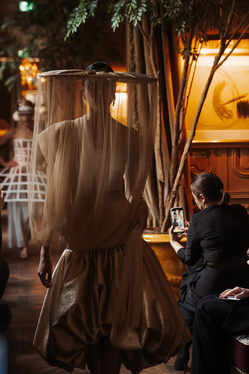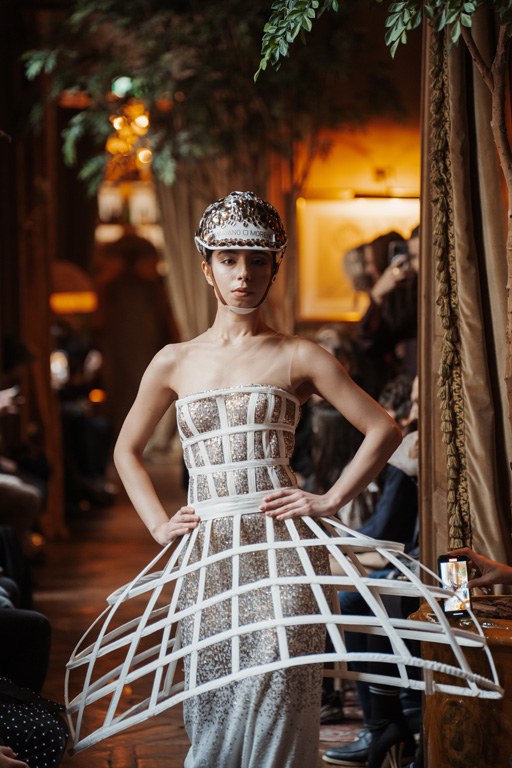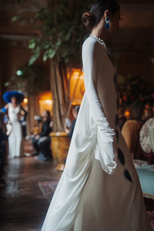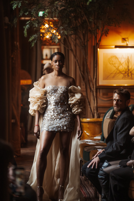 “ARCHIVES” tributes to architecture, decorative arts and materiality, reinterpreted through sculptural volumes, precisely cut patterns and a meticulous selection of ornamental details. The collection incorporates materials and accessories from the field of architecture, masterfully adapted to Haute Couture, subtly fusing both disciplines in an exercise of innovation and refinement. The set design, devised by Mariano Moreno for his Paris debut, is based on archive images of the first Haute Couture fashion shows. With an atmosphere of constructive nostalgia, the set design evokes the fantasy and timeless elegance of fashion, celebrating the looks of the “ARCHIVES” collection in perfect harmony between past and present.