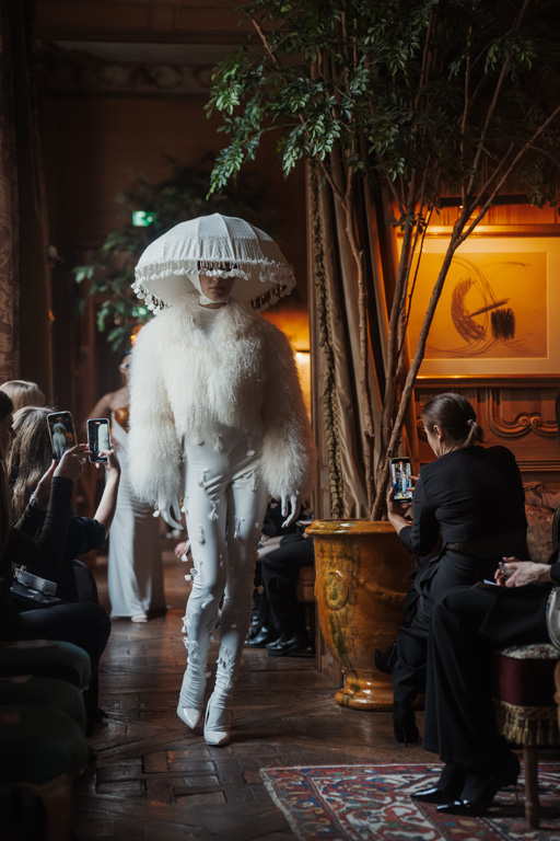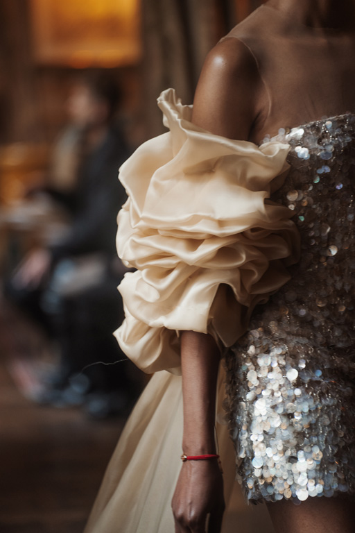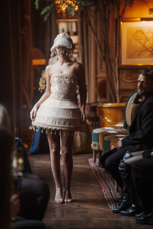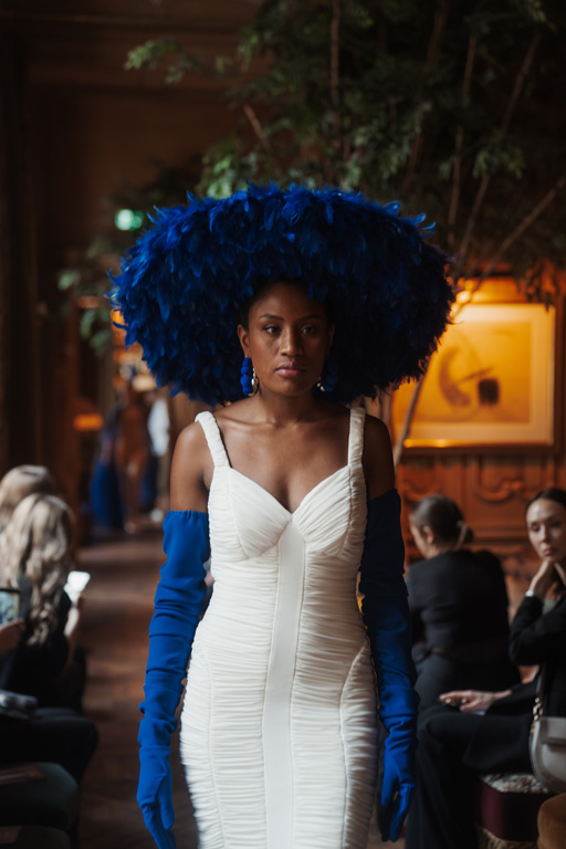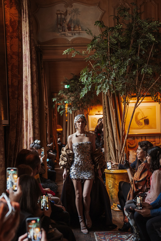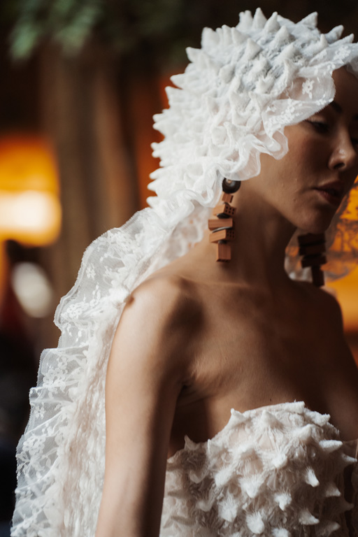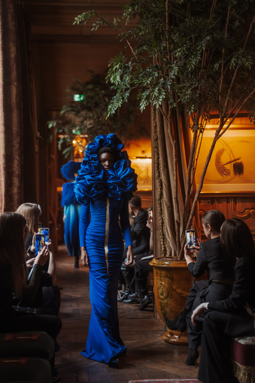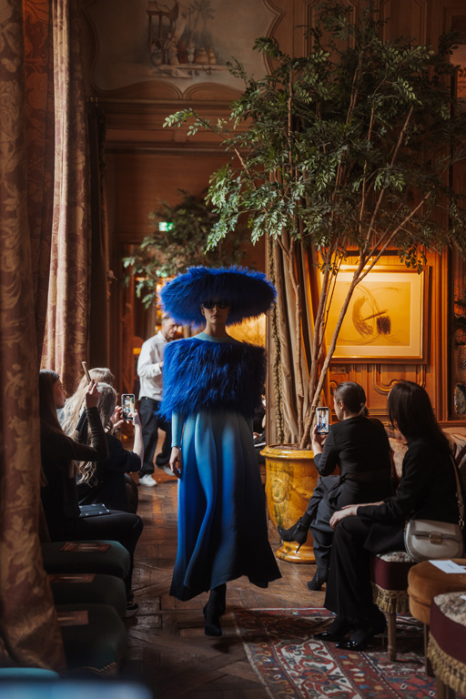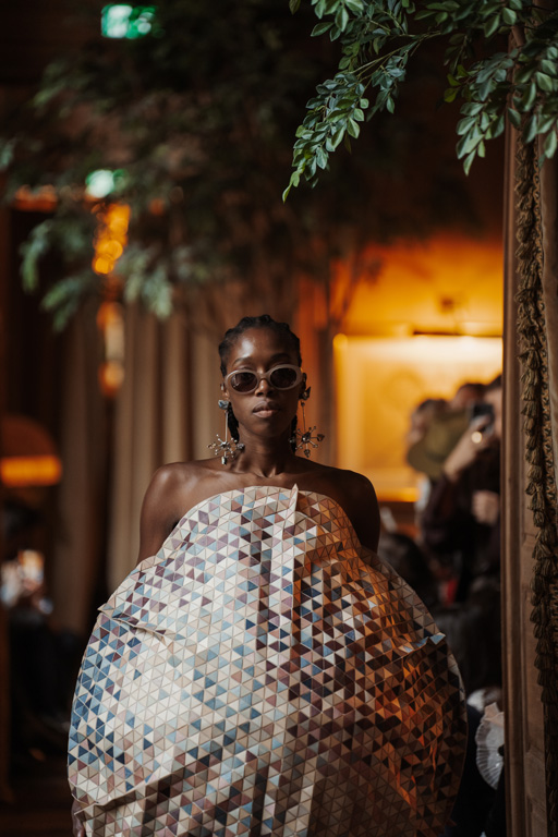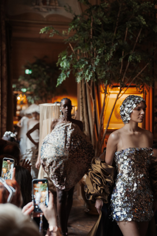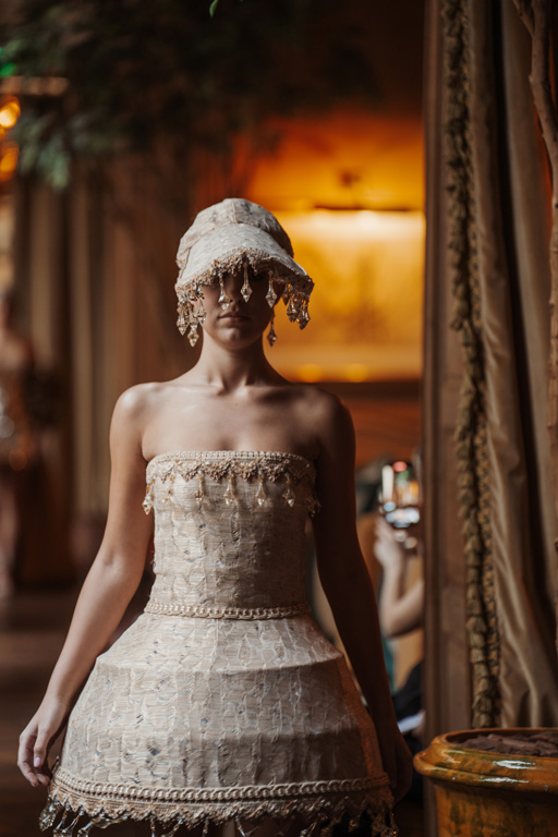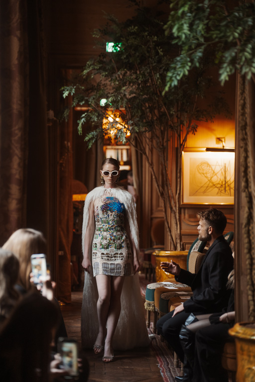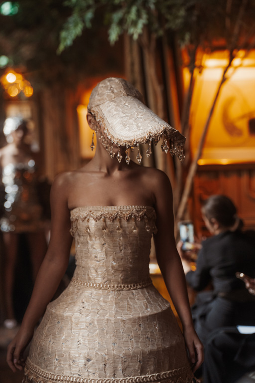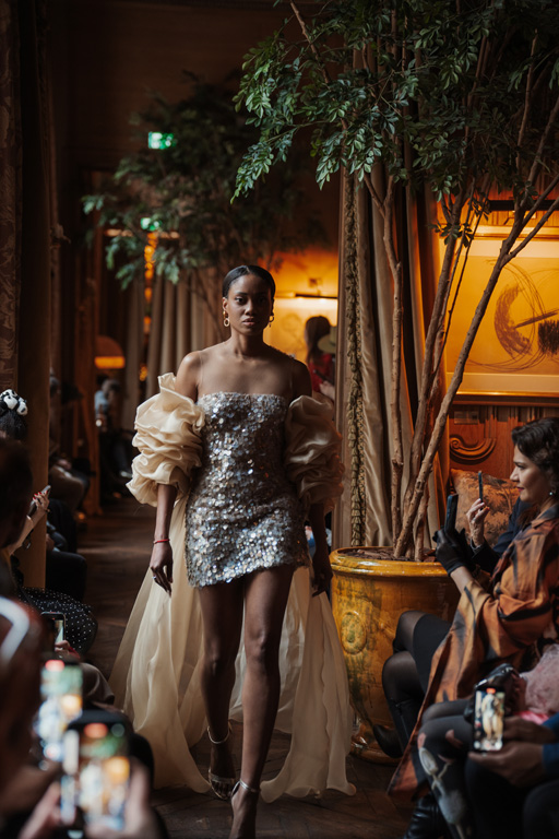 “ARCHIVES” tributes to architecture, decorative arts and materiality, reinterpreted through sculptural volumes, precisely cut patterns and a meticulous selection of ornamental details. The collection incorporates materials and accessories from the field of architecture, masterfully adapted to Haute Couture, subtly fusing both disciplines in an exercise of innovation and refinement. The set design, devised by Mariano Moreno for his Paris debut, is based on archive images of the first Haute Couture fashion shows. With an atmosphere of constructive nostalgia, the set design evokes the fantasy and timeless elegance of fashion, celebrating the looks of the “ARCHIVES” collection in perfect harmony between past and present.