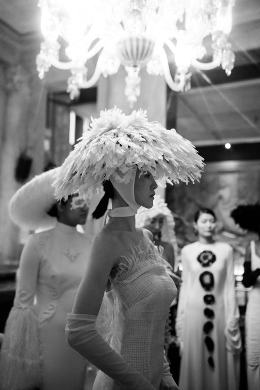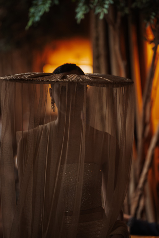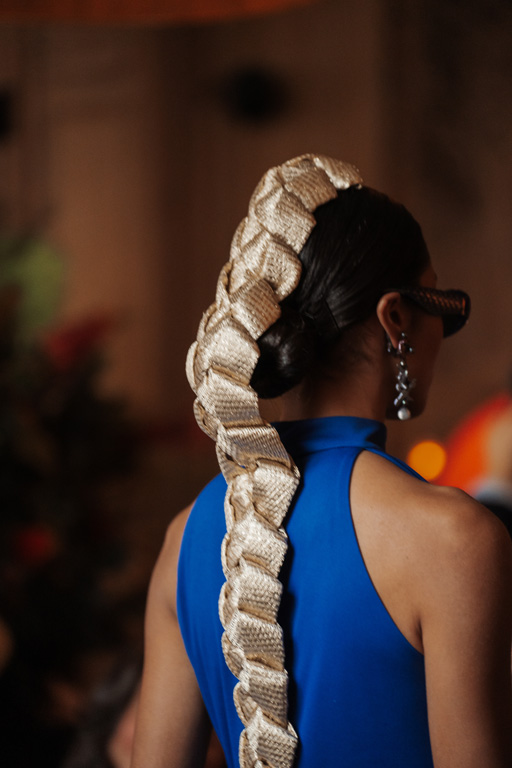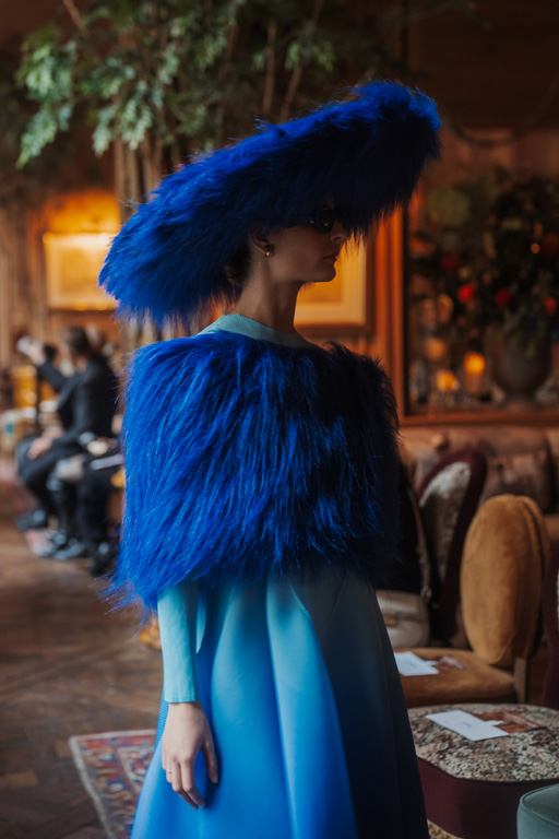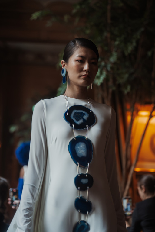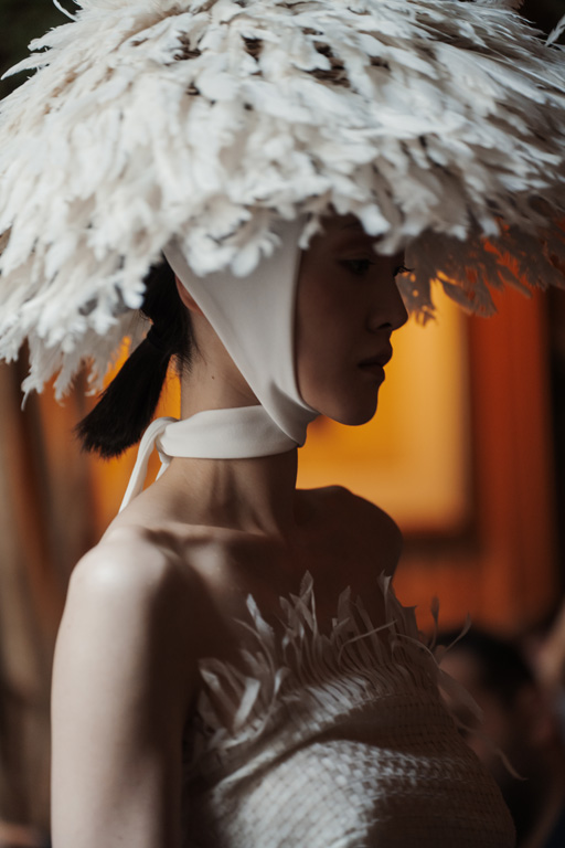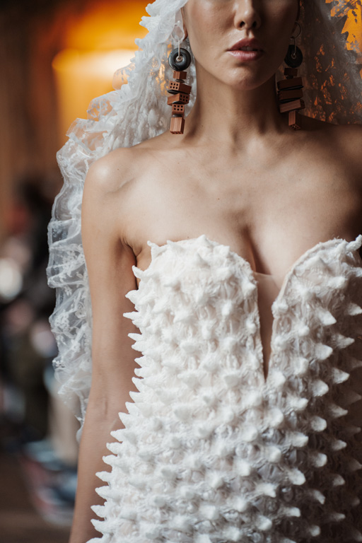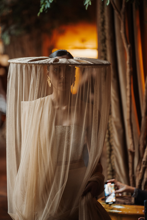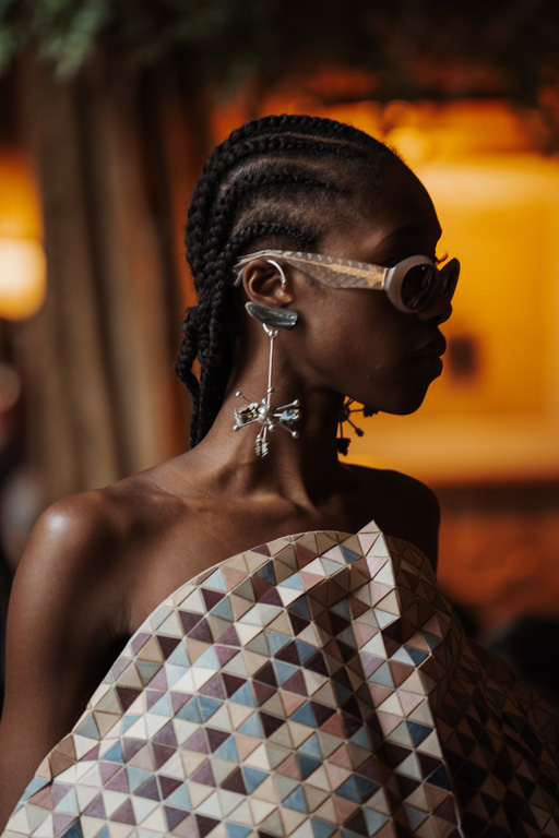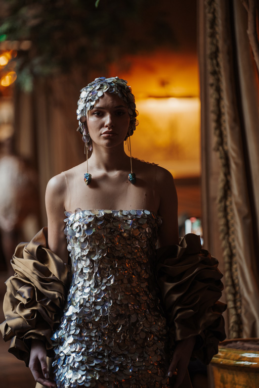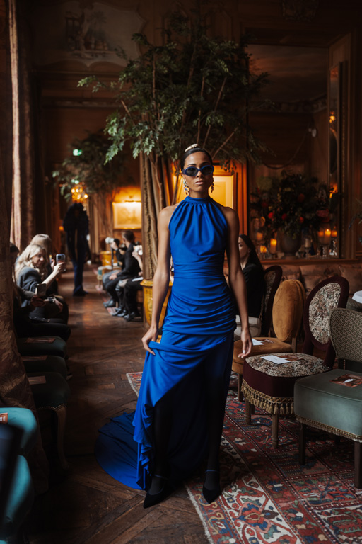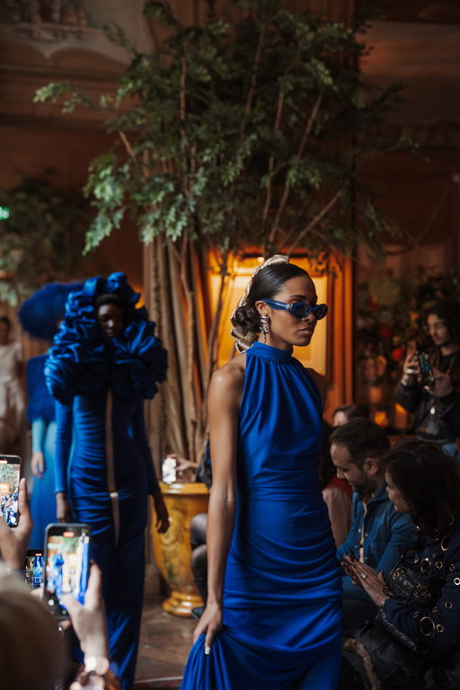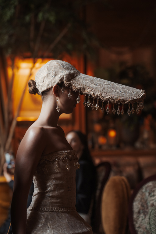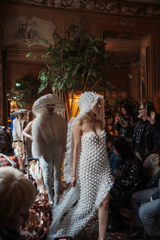 “ARCHIVES” tributes to architecture, decorative arts and materiality, reinterpreted through sculptural volumes, precisely cut patterns and a meticulous selection of ornamental details. The collection incorporates materials and accessories from the field of architecture, masterfully adapted to Haute Couture, subtly fusing both disciplines in an exercise of innovation and refinement. The set design, devised by Mariano Moreno for his Paris debut, is based on archive images of the first Haute Couture fashion shows. With an atmosphere of constructive nostalgia, the set design evokes the fantasy and timeless elegance of fashion, celebrating the looks of the “ARCHIVES” collection in perfect harmony between past and present.