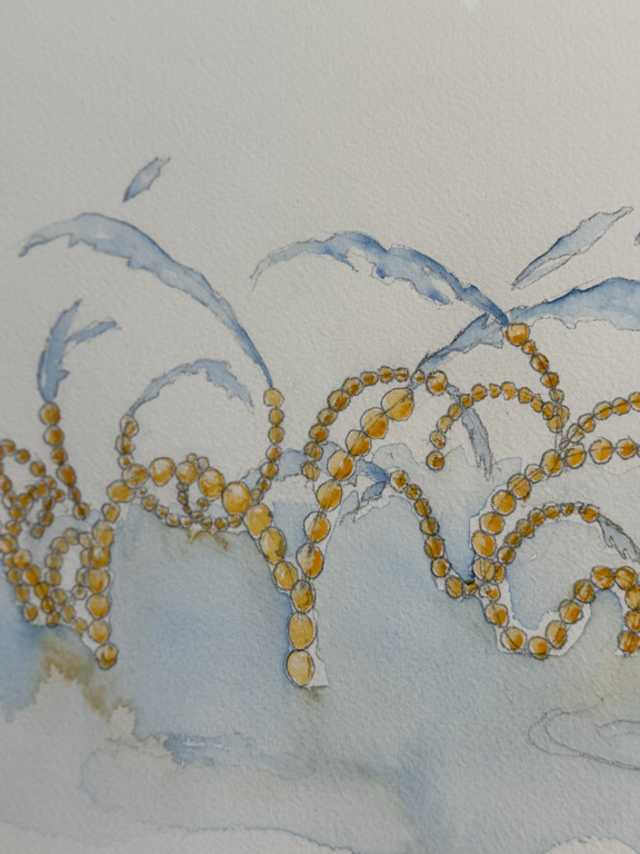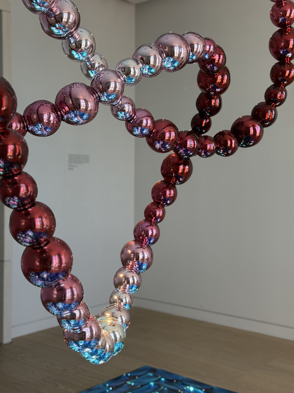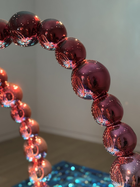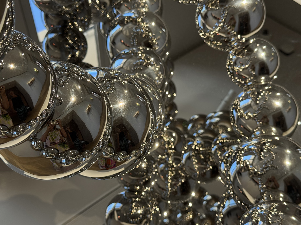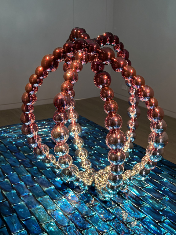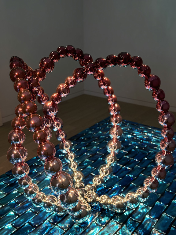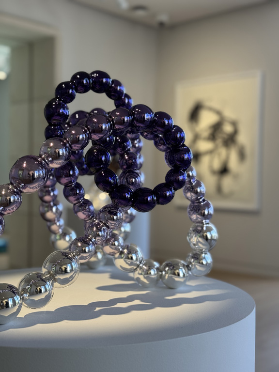 Othoniel collaborated with a landscape architect in 2010 to restore the historic Water Theater grove at the Palace of Versailles, which had been created between 1671-1674 but destroyed in 1775, by creating monumental glass and gold sculptures for the fountains. In his current exhibition, Othoniel explores the motif of the chrysanthemum, an emblematic flower in Japanese culture, using mirrored glass sculptures and ink drawings to capture its symbolism of ephemeral beauty, rebirth and eternity.