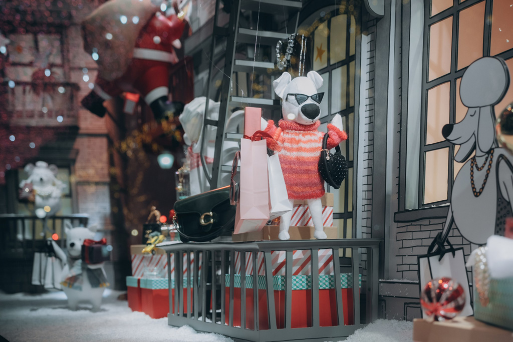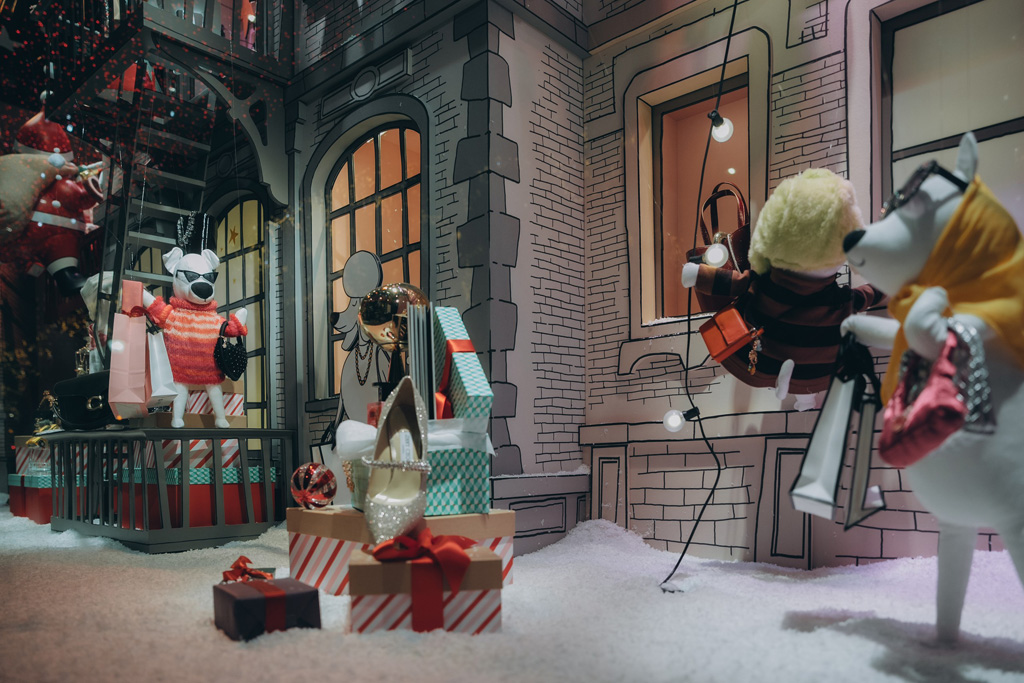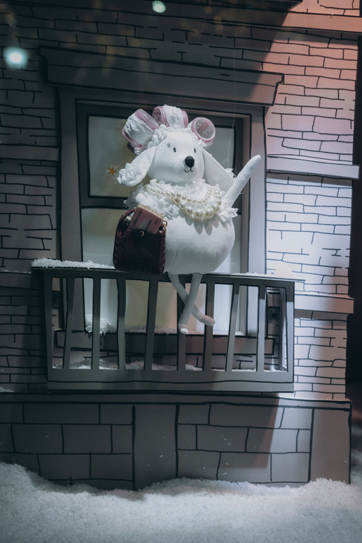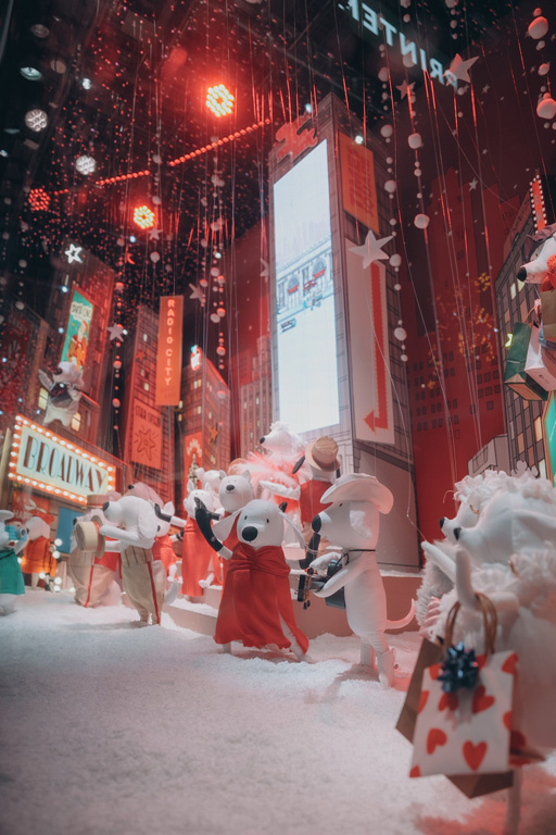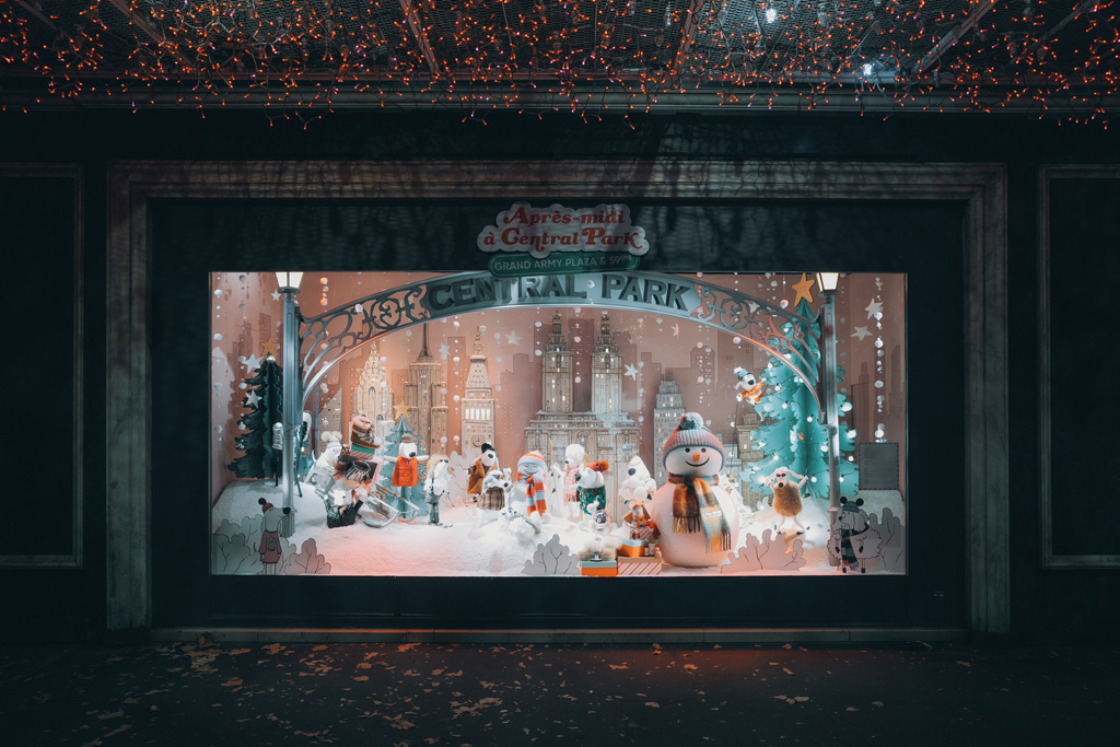 Designed to create a winter fairy tale atmosphere, the windows include animated characters, music, and shimmering lights, all crafted in a black-and-white graphic style inspired by the cartoons of The New Yorker.