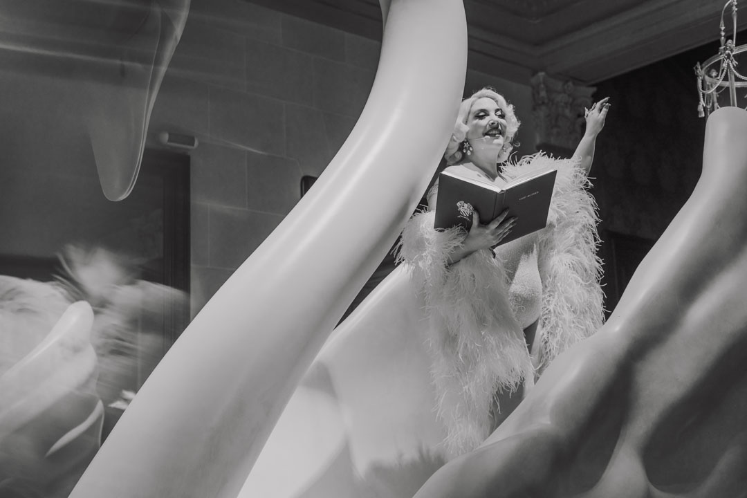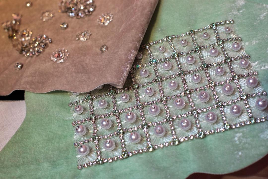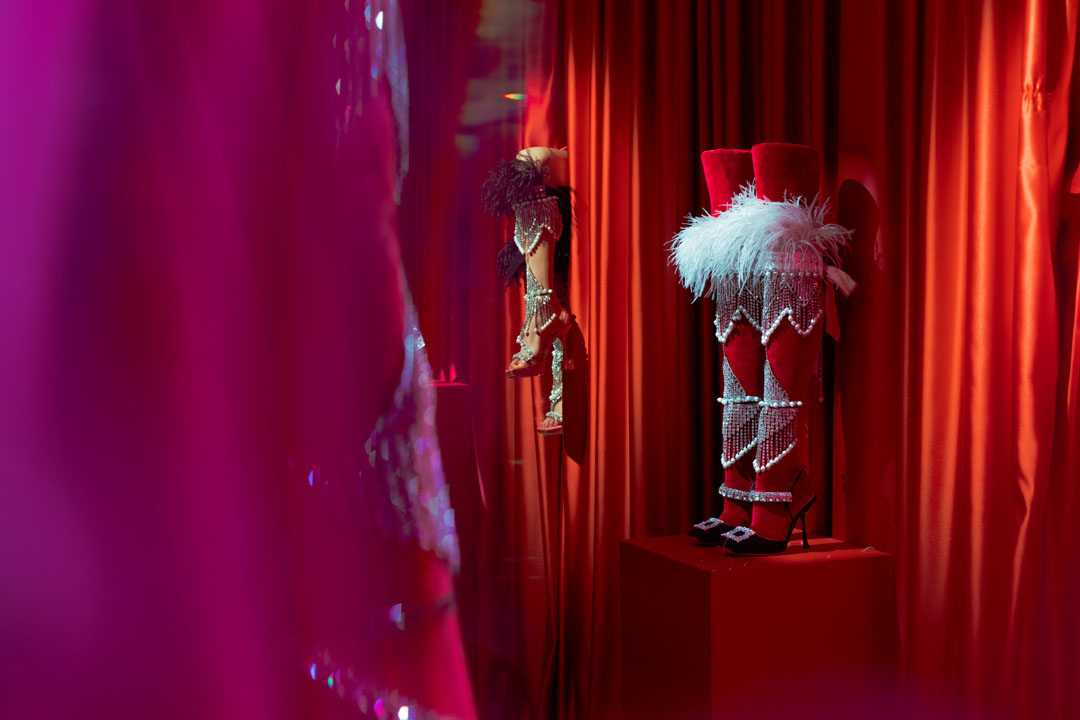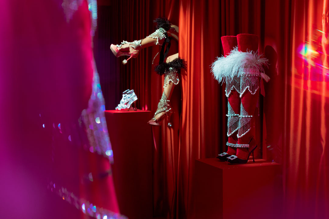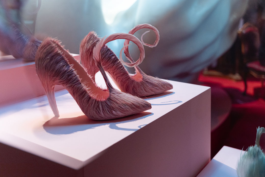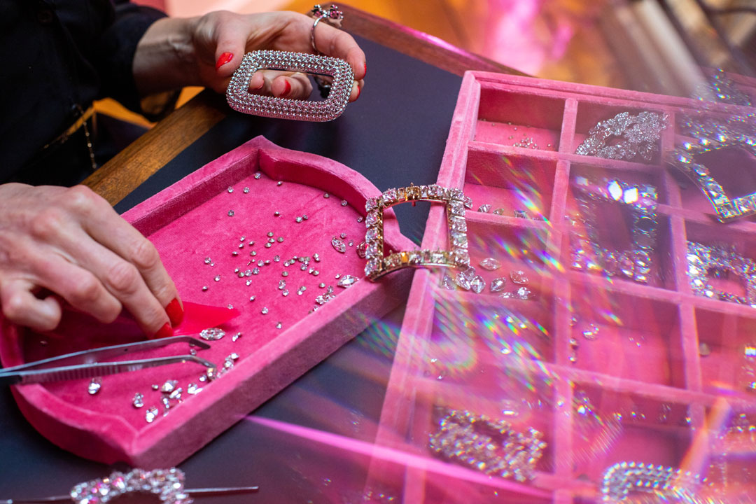 Exceptional meticulousness, as shown by the iconic Viv’ Choc bag, emerges through a neon-pink satin variation topped with a rhinestone buckle. No fewer than twenty-five unique models of the Viv’ Choc are included, featuring a variety of embroidered finishes and crystal jewellery buckles.