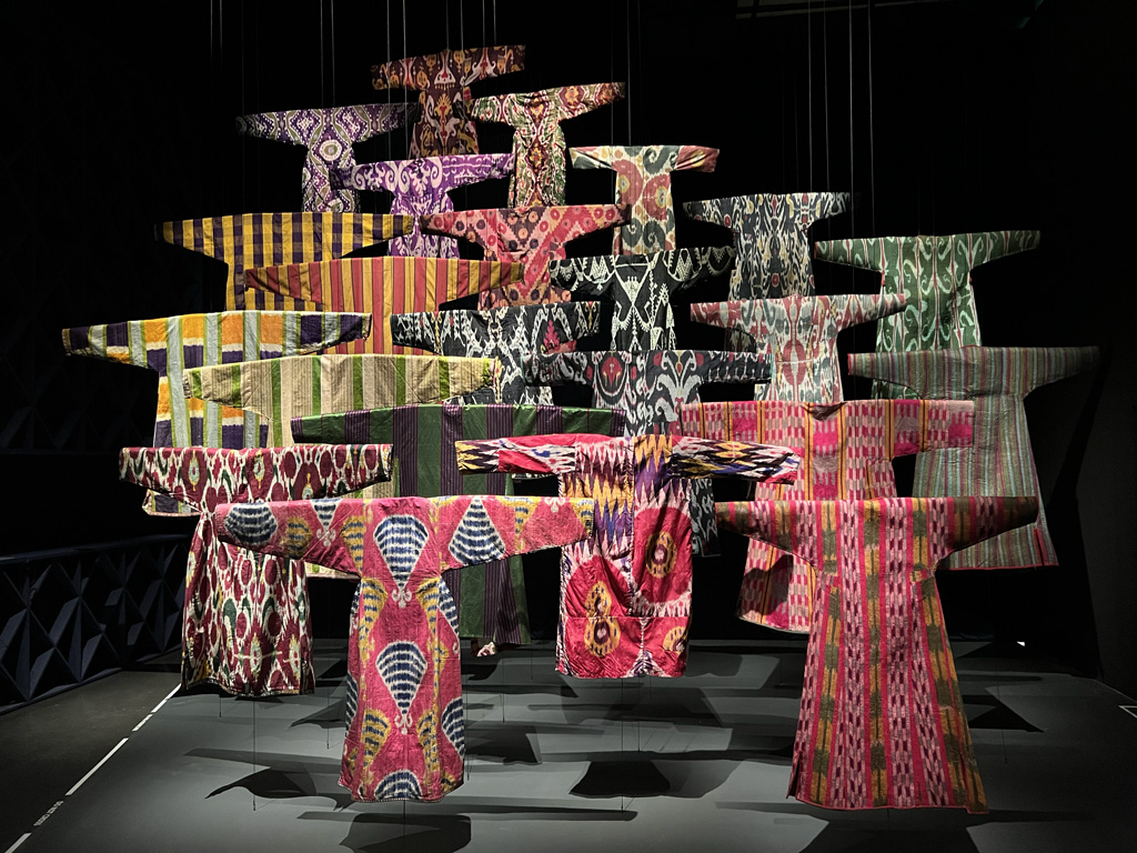 Many other pieces are to be discovered throughout the exhibition, offering a broader perspective of the society of the time, including the famous ikats and their anthology of colors, weavings resulting from ancestral techniques, and regional stylistic specificities from Khorezm, the Ferghana Valley or the Karakalpak region, where accumulations of jewellery extended the female wardrobe.