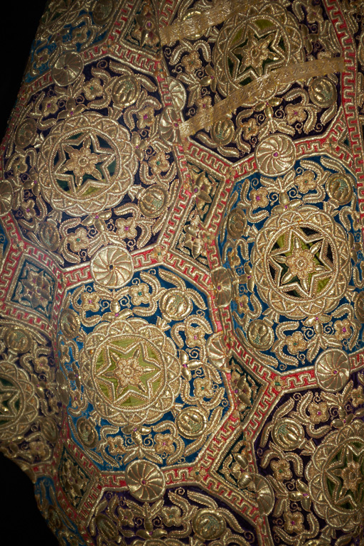 It was during the Emirate of Bukhara (1785-1920) that gold embroidery reached its peak and its fame in terms of technique, quality and above all creativity. A number of splendid and monumental productions – chapans, dresses, headdresses, saddle cloths mixing colors and gold – reserved for the court and for diplomatic gifts were exclusively made in the private workshop of the emir and bear witness to his opulent art of living.