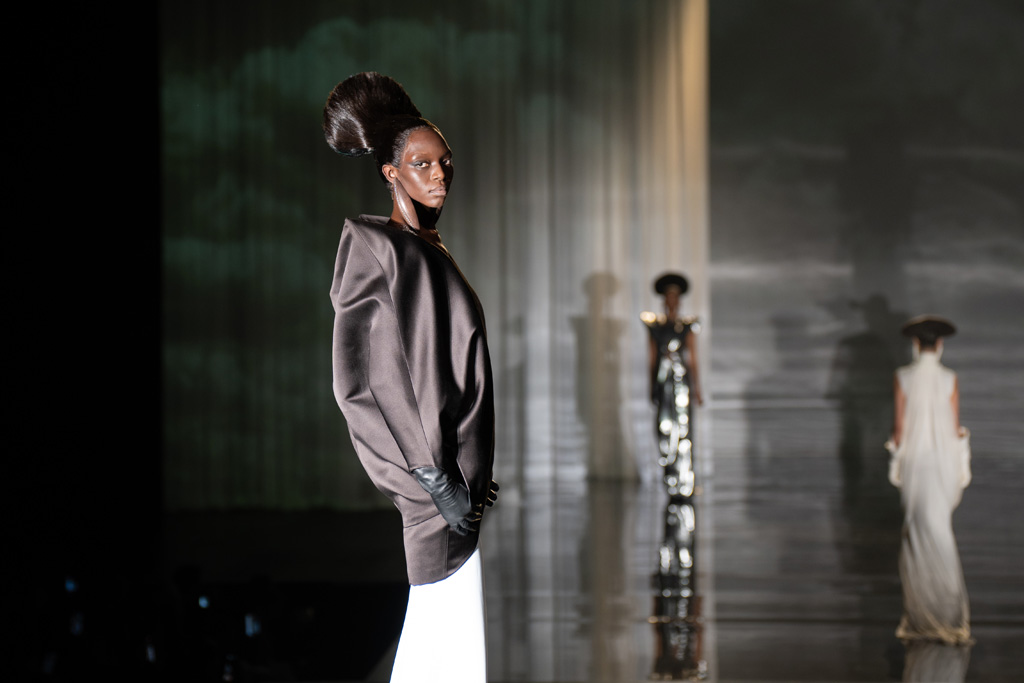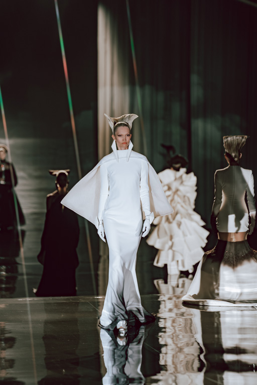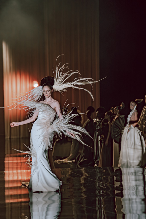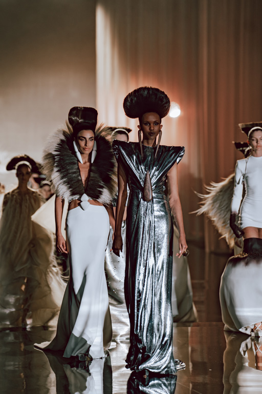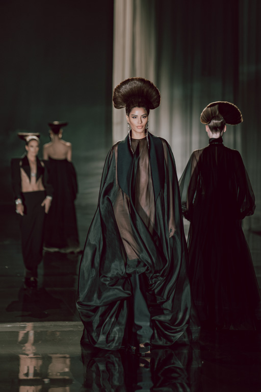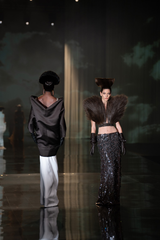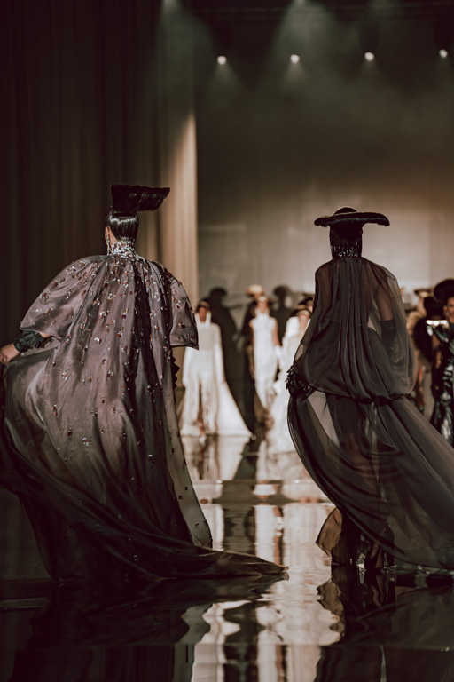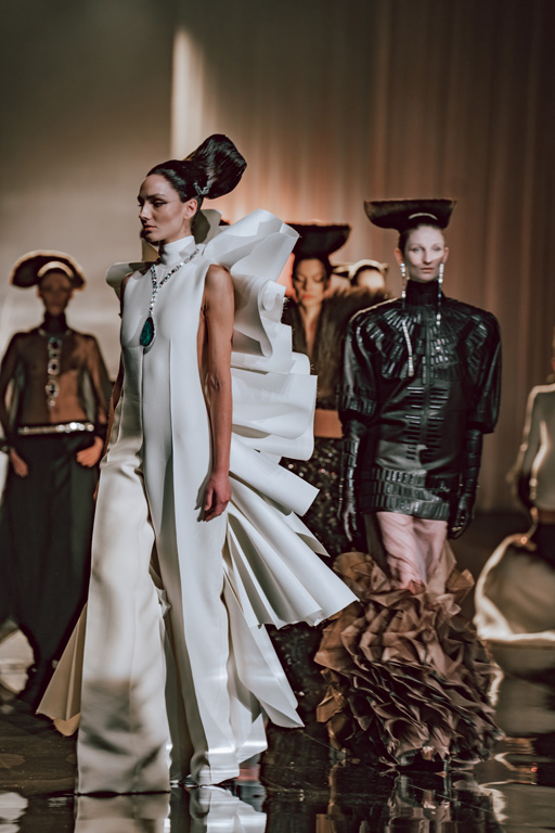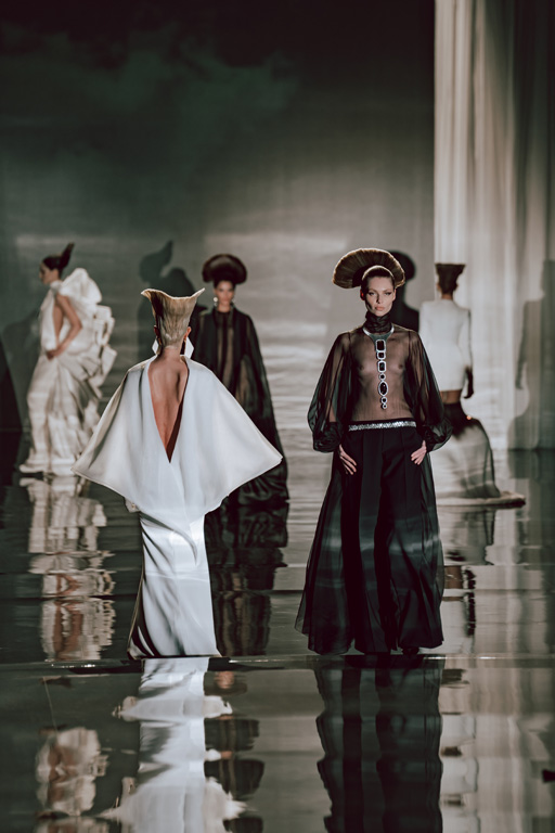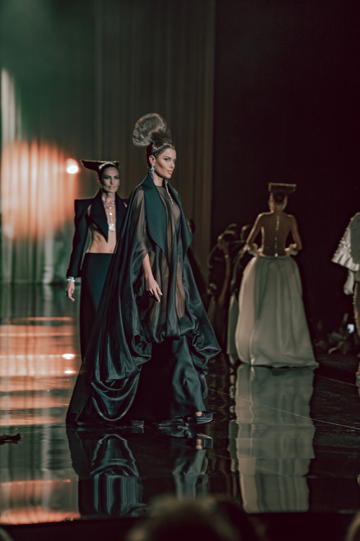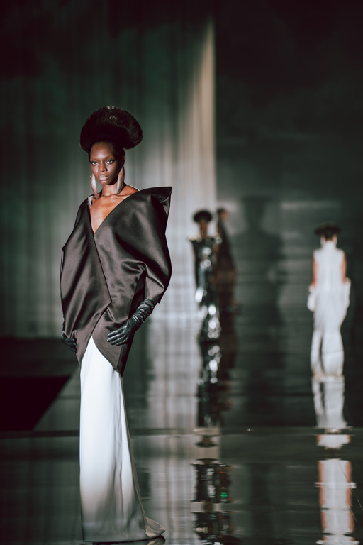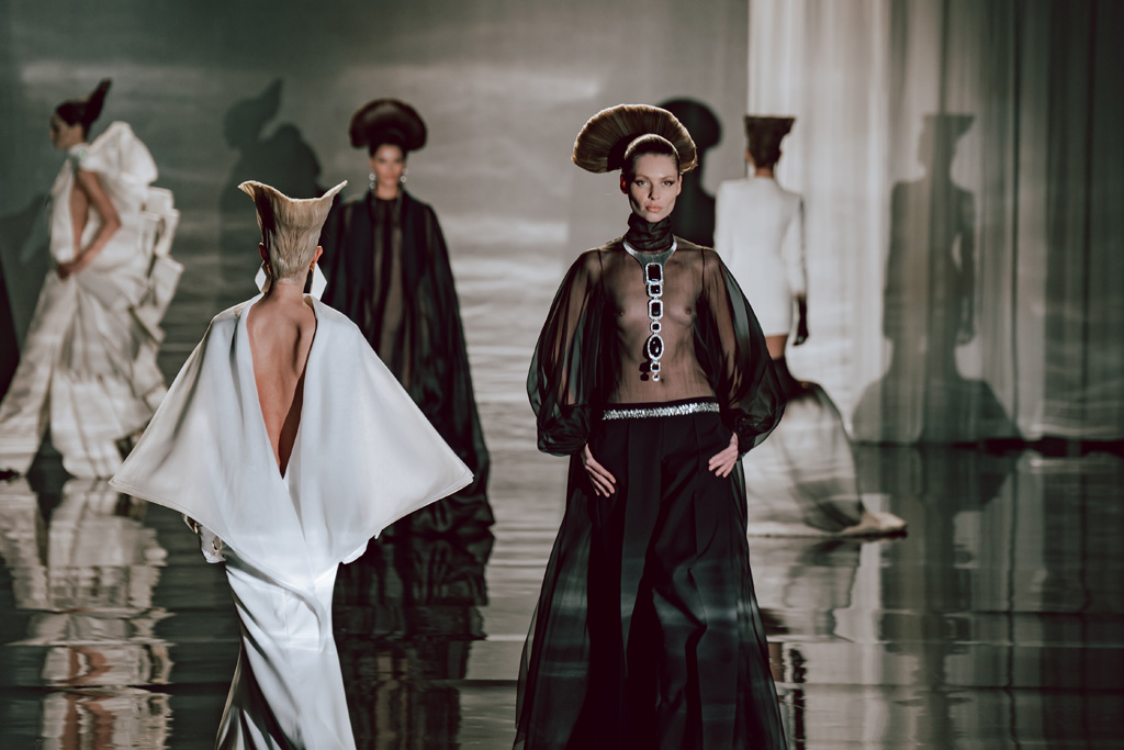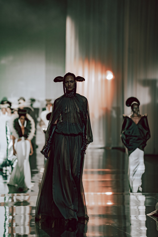 The collection reflects this union, featuring strong silhouettes and luxurious materials like gazar, satin, and organza, predominantly in black and white with gold and crystal accents.