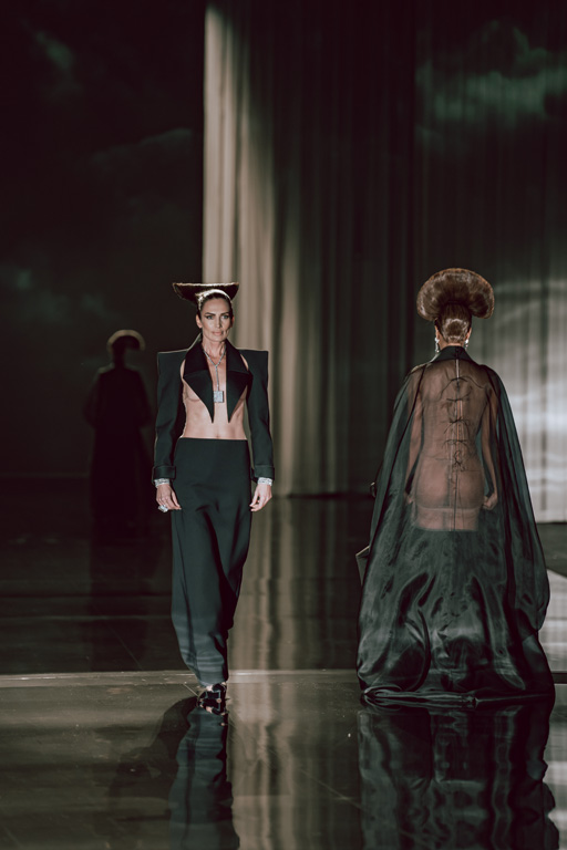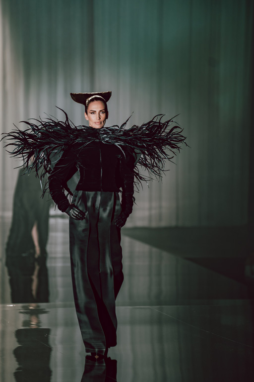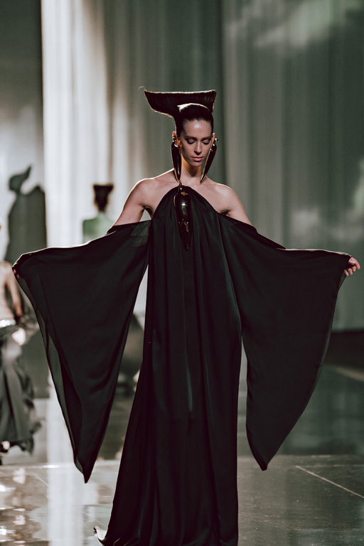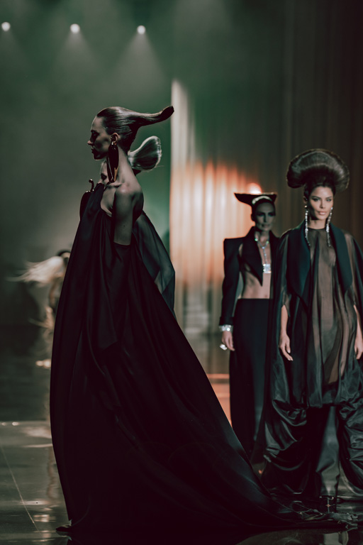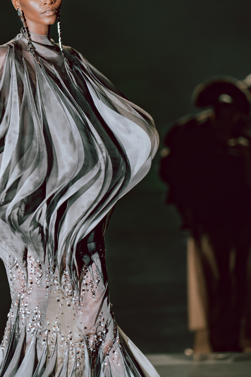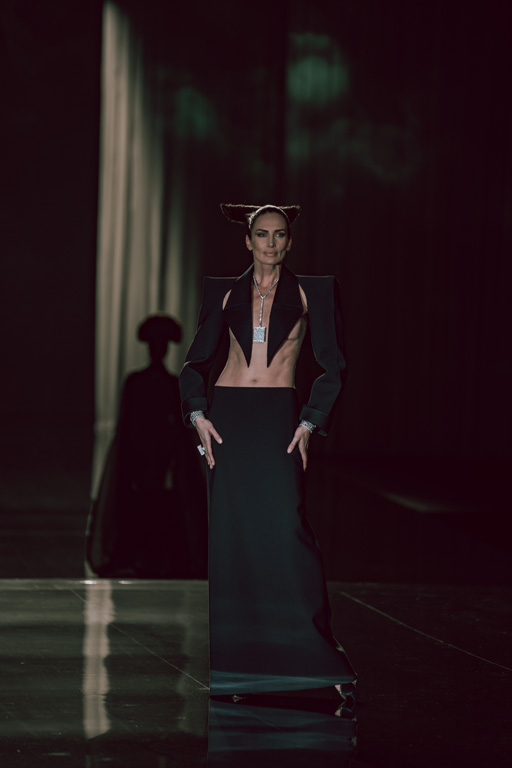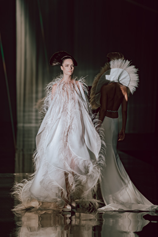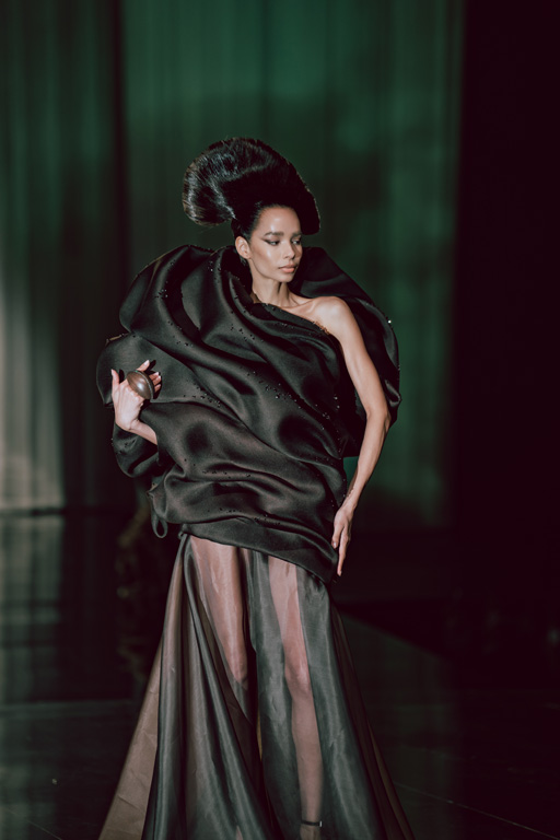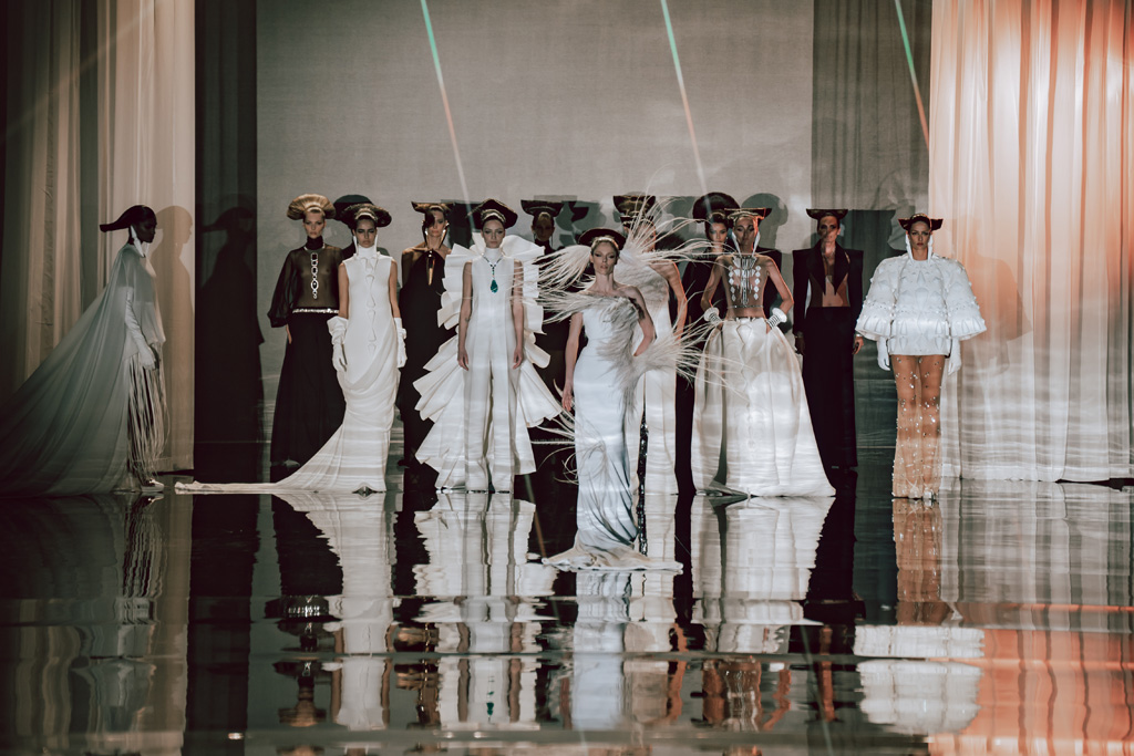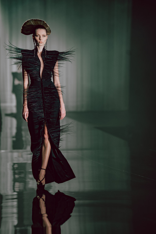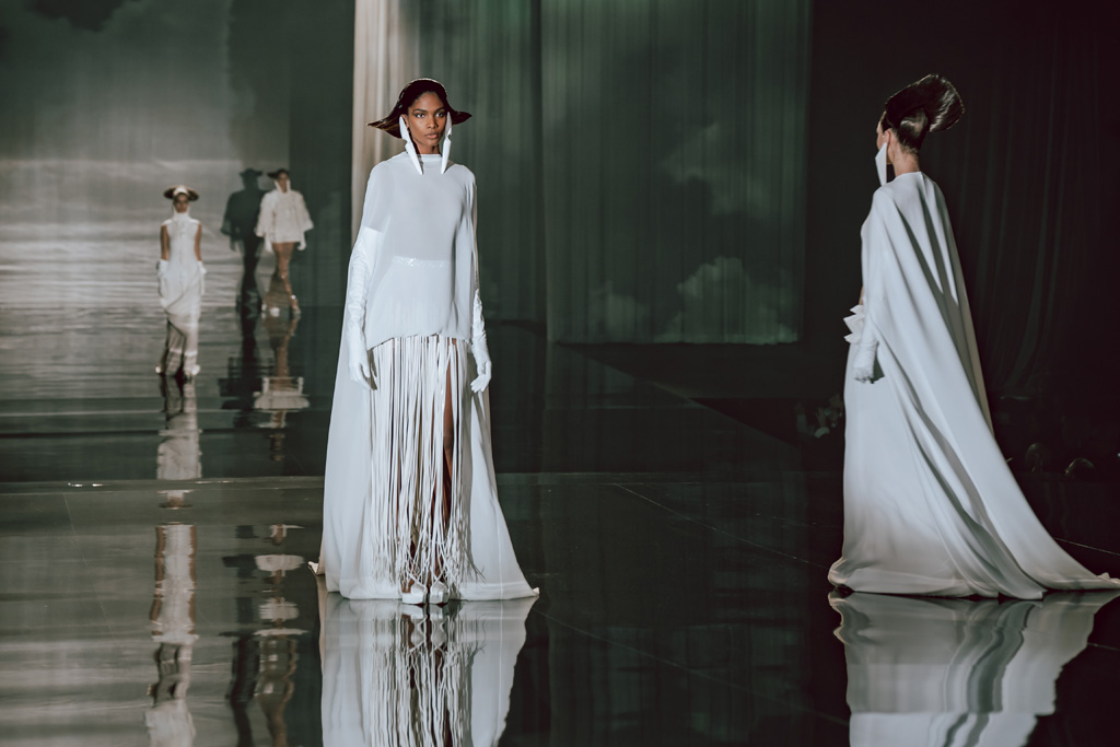 The collection reflects this union, featuring strong silhouettes and luxurious materials like gazar, satin, and organza, predominantly in black and white with gold and crystal accents.