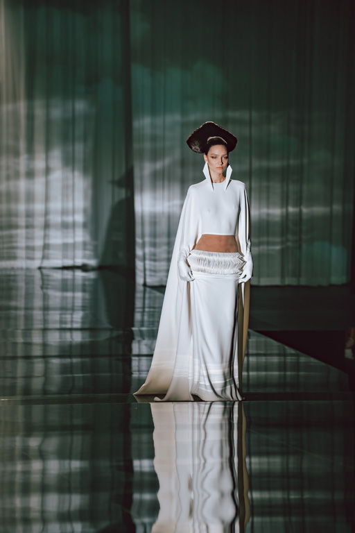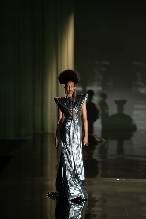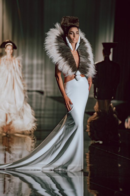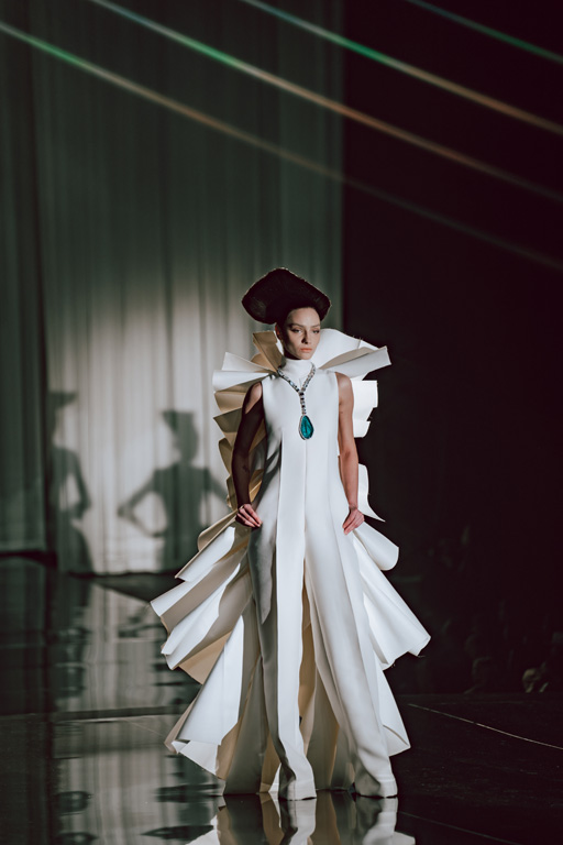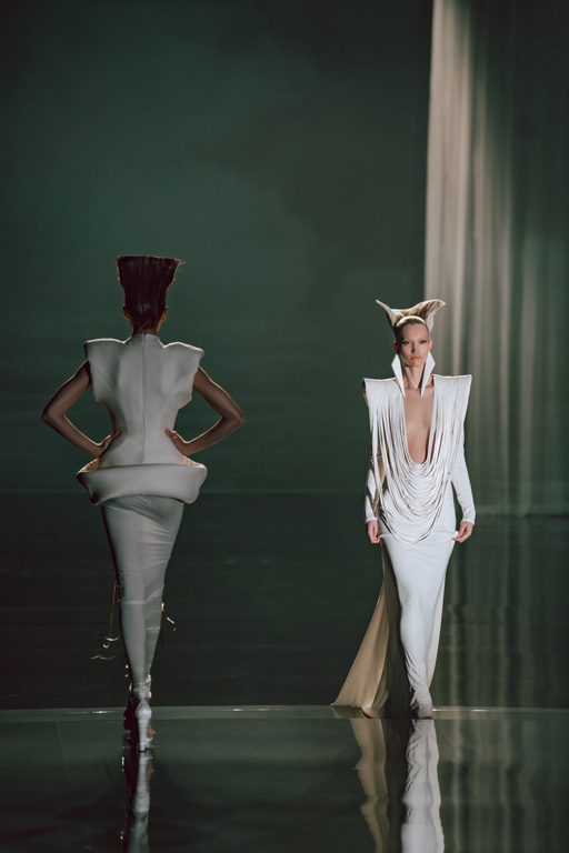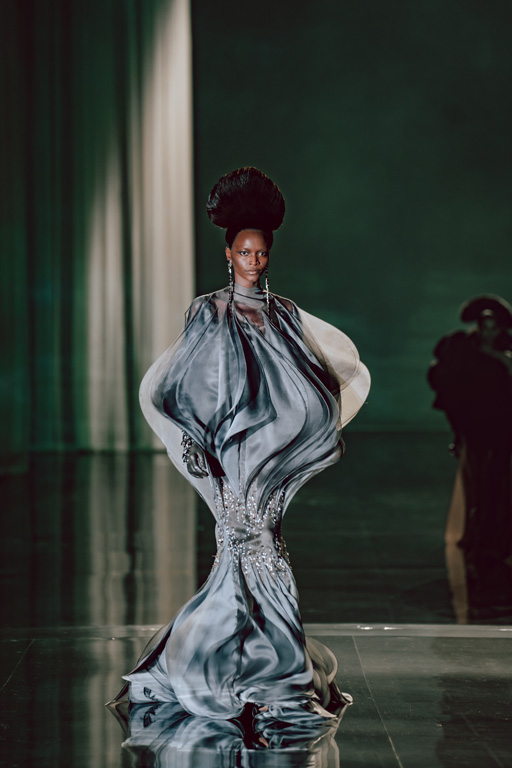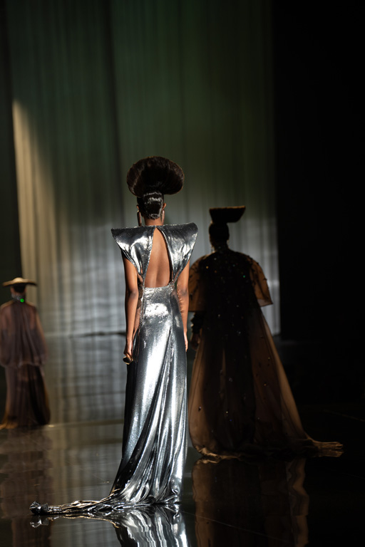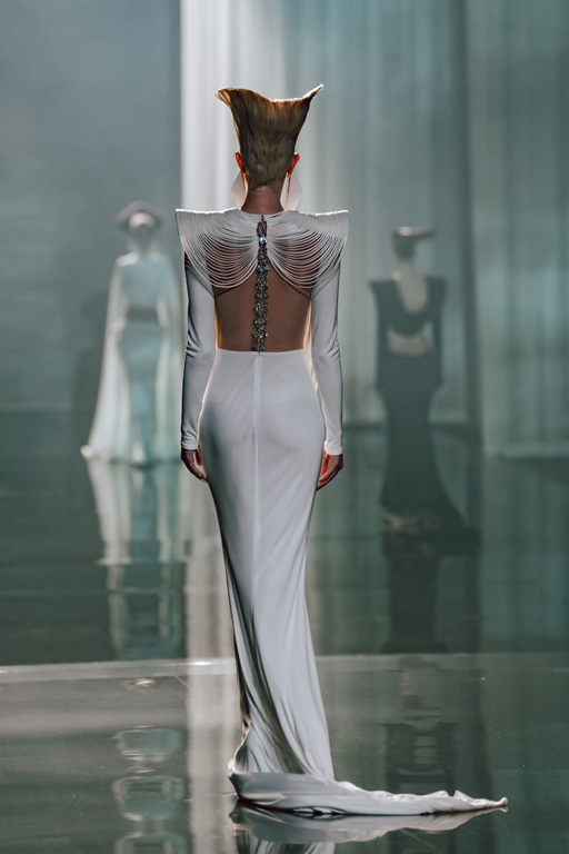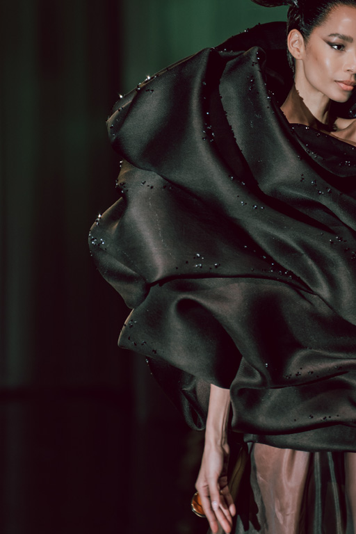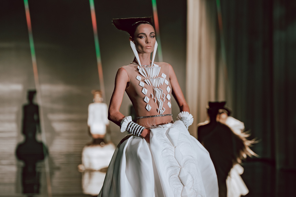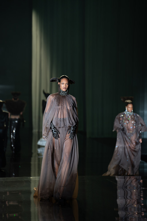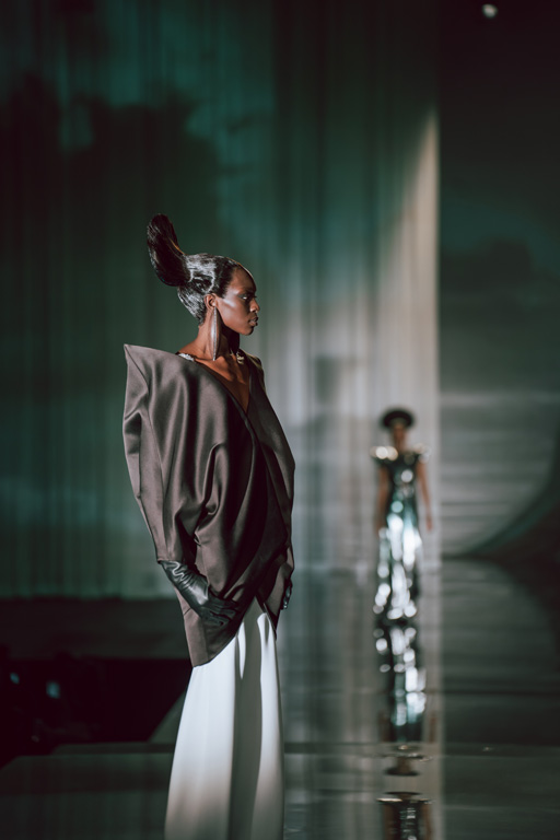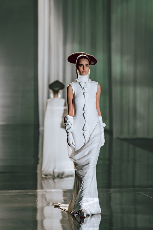 The collection reflects this union, featuring strong silhouettes and luxurious materials like gazar, satin, and organza, predominantly in black and white with gold and crystal accents.