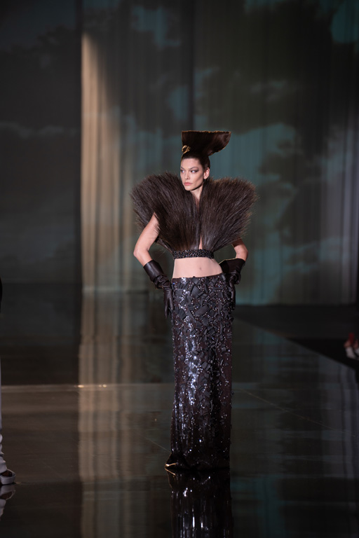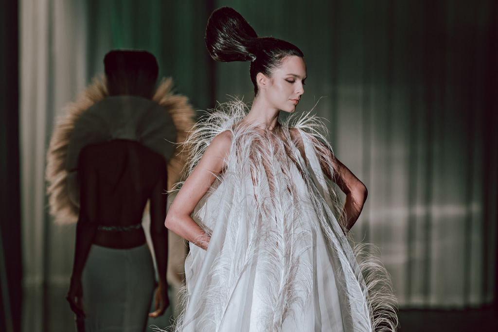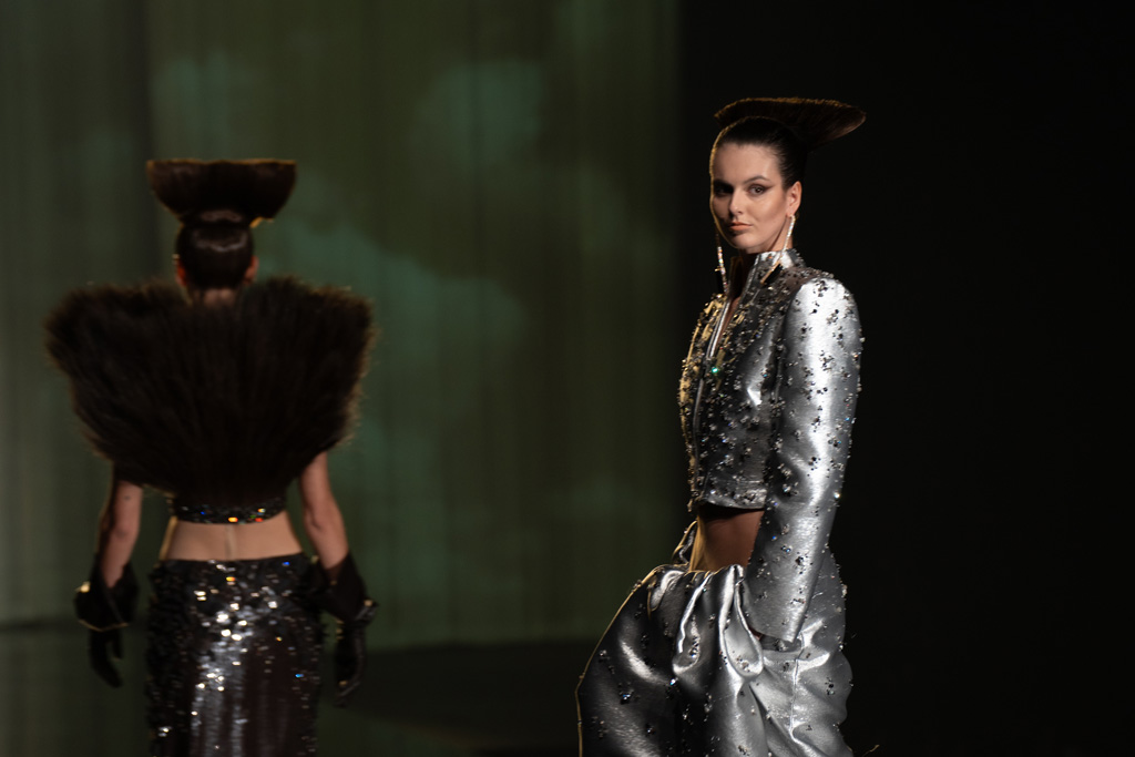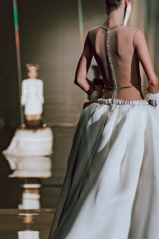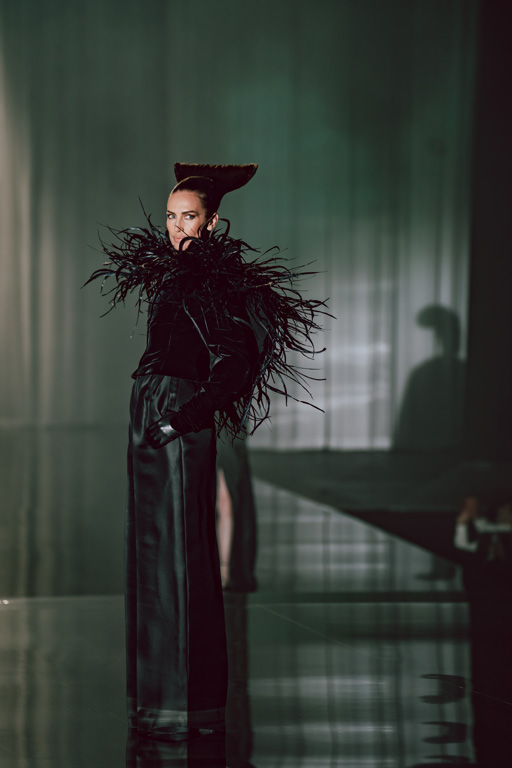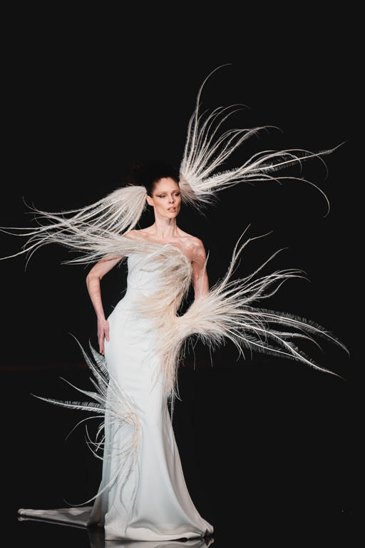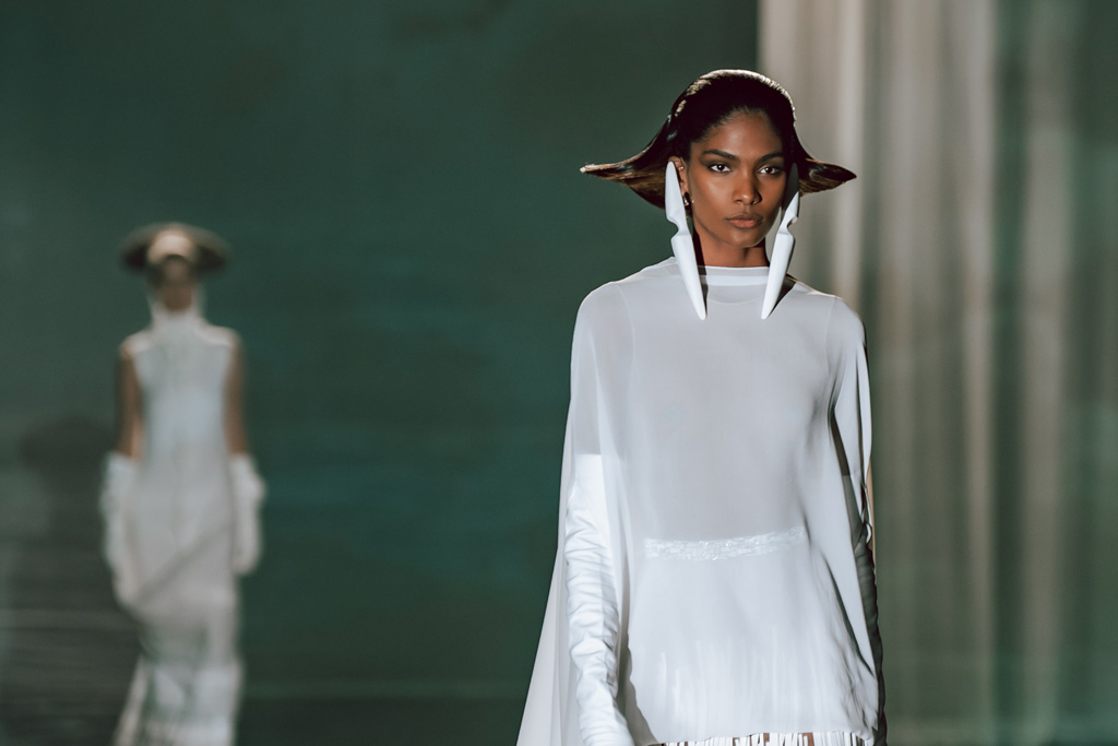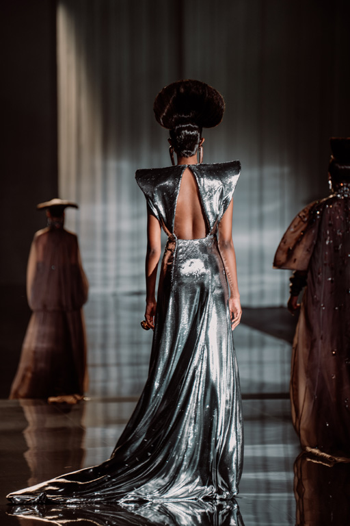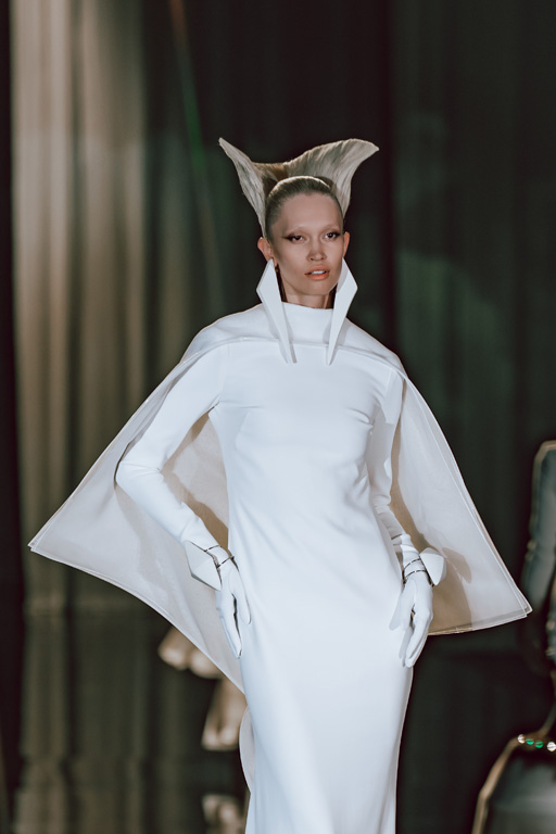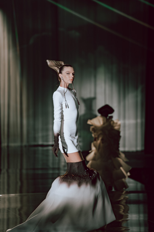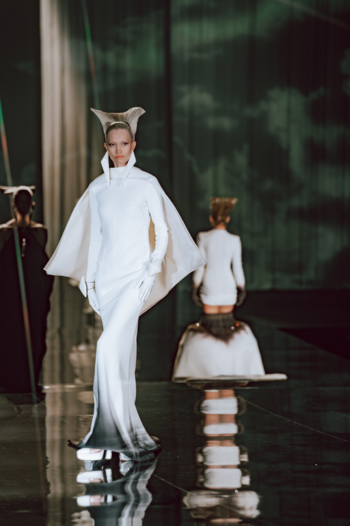 The collection reflects this union, featuring strong silhouettes and luxurious materials like gazar, satin, and organza, predominantly in black and white with gold and crystal accents.