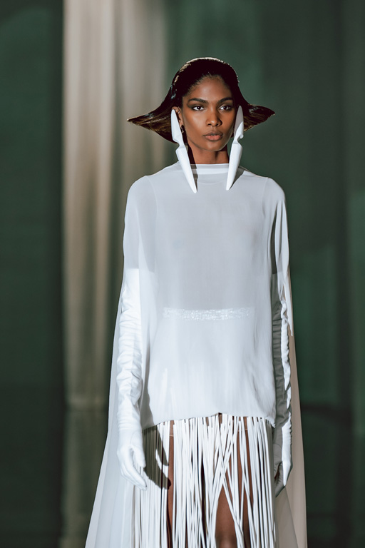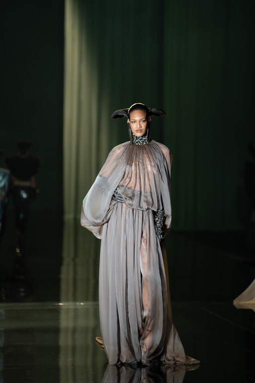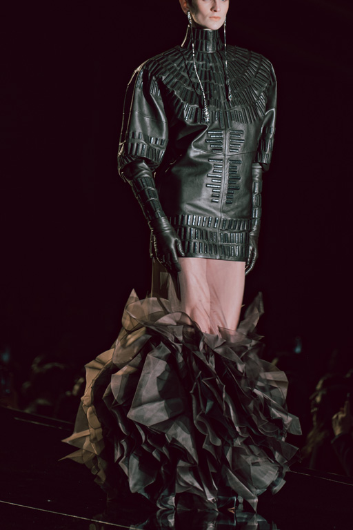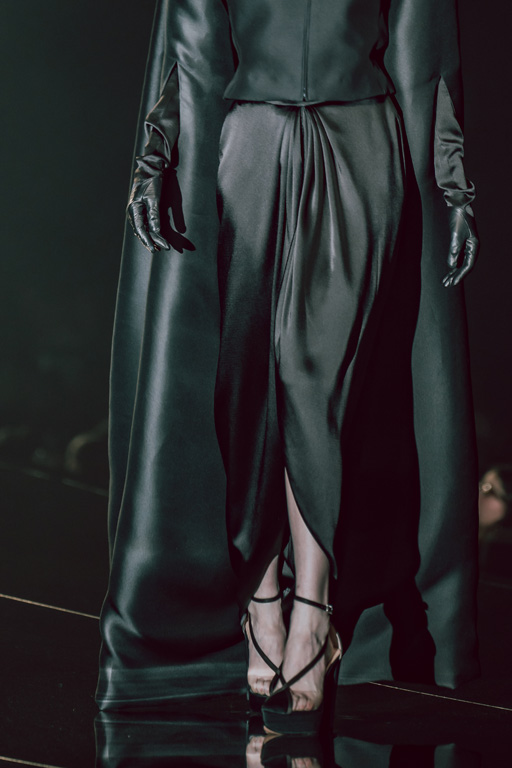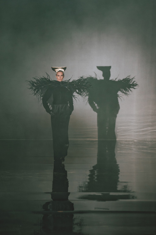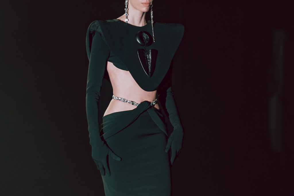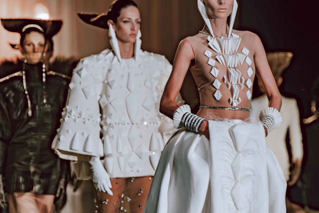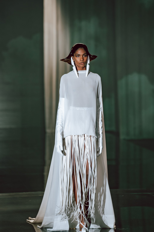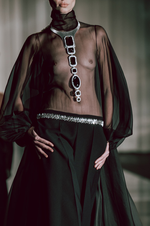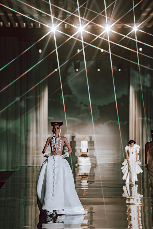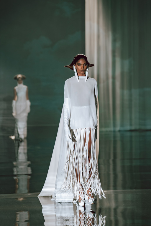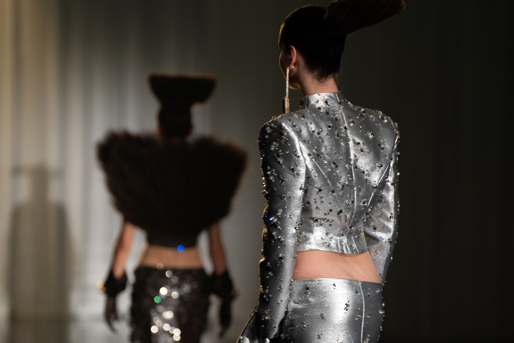 The collection reflects this union, featuring strong silhouettes and luxurious materials like gazar, satin, and organza, predominantly in black and white with gold and crystal accents.