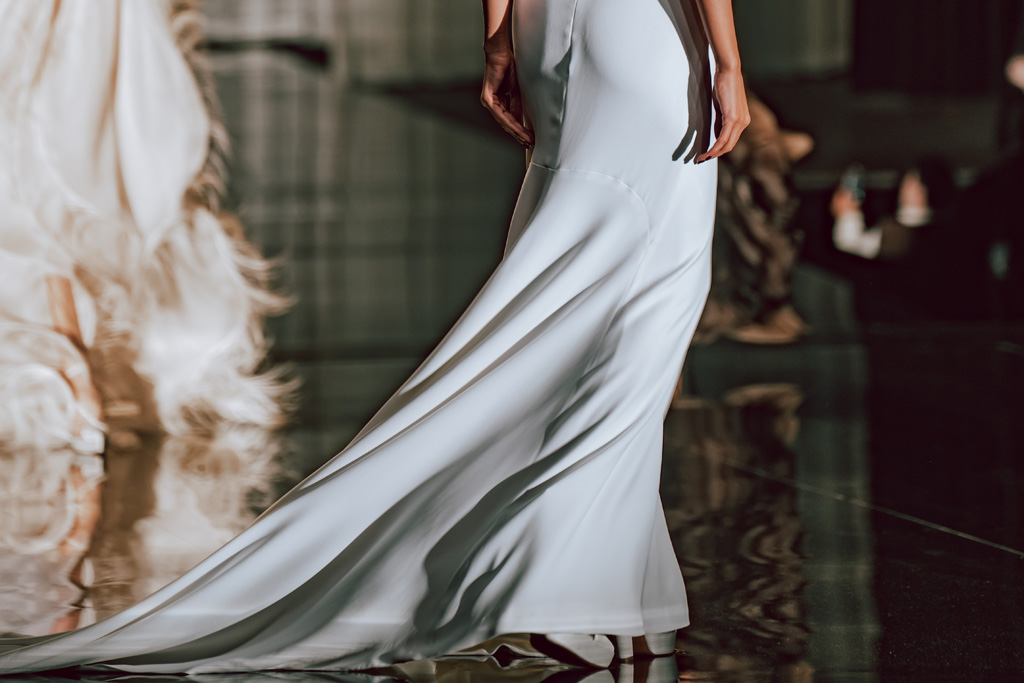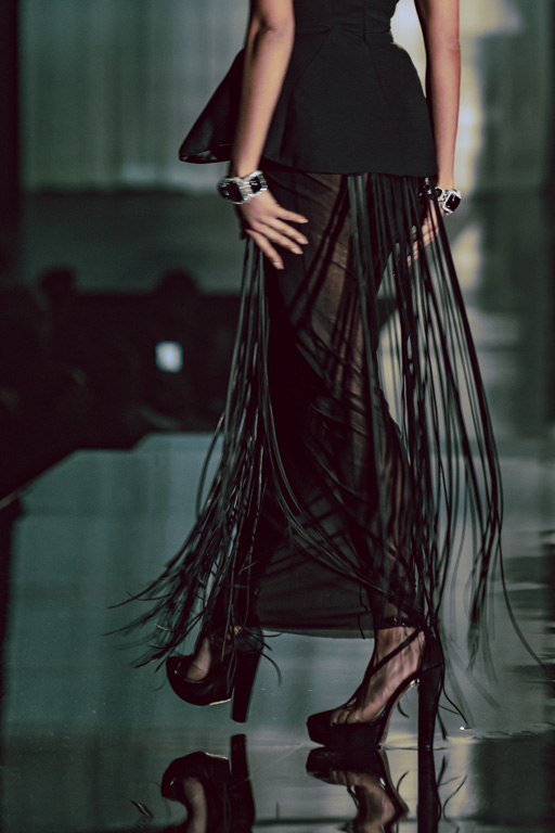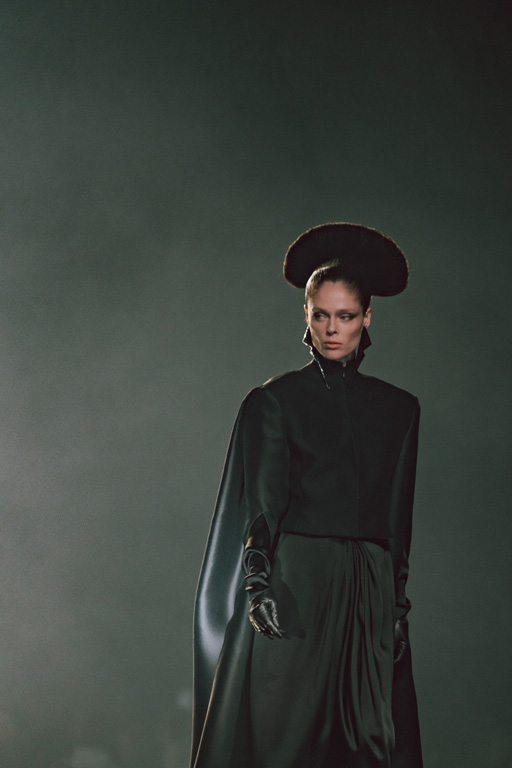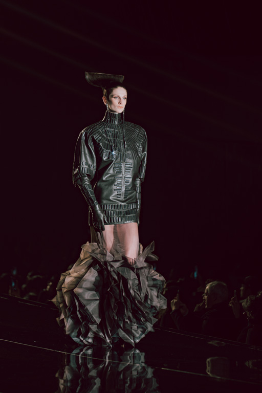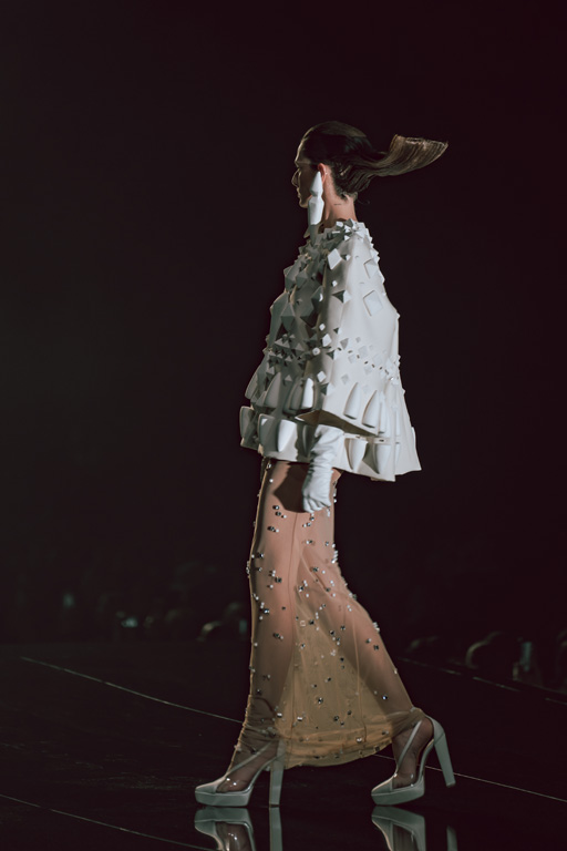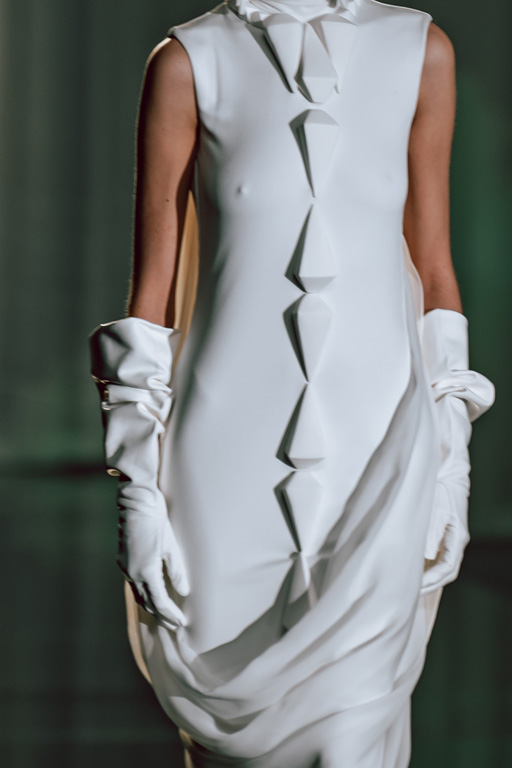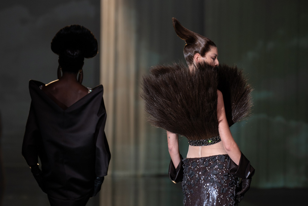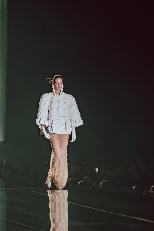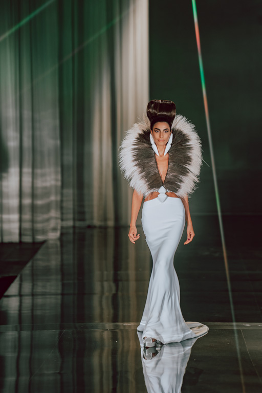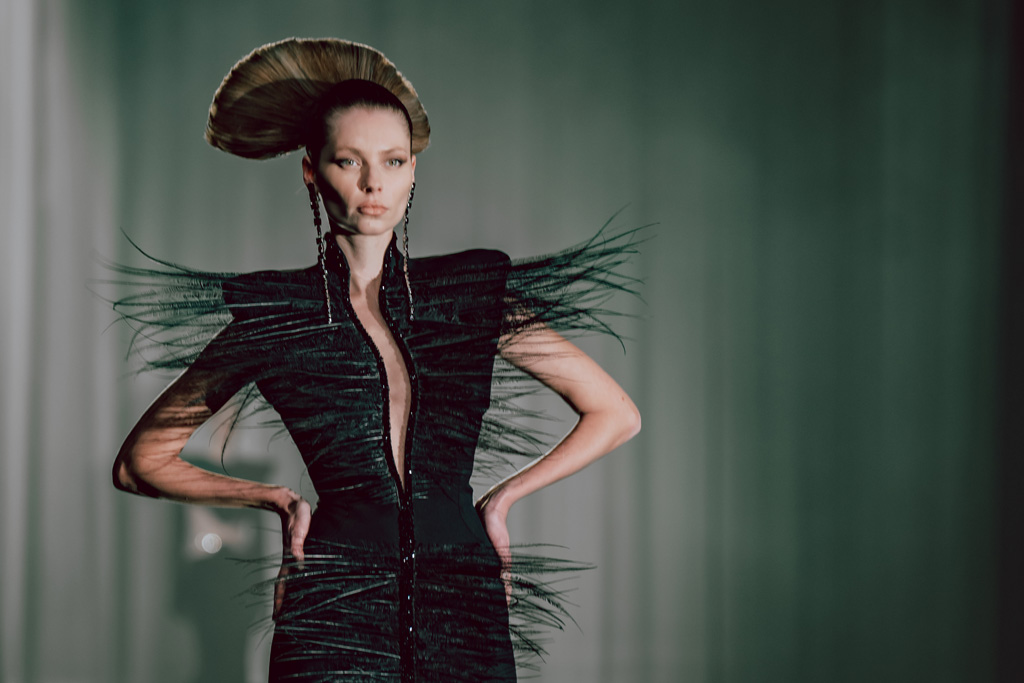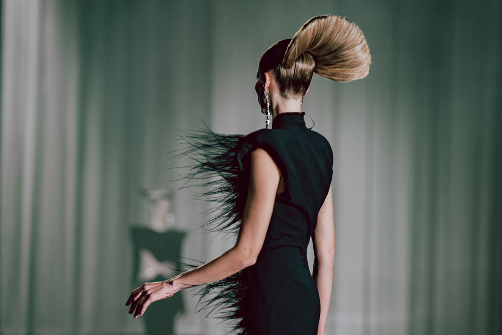 The collection reflects this union, featuring strong silhouettes and luxurious materials like gazar, satin, and organza, predominantly in black and white with gold and crystal accents.