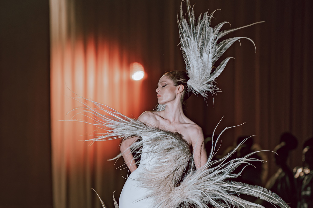 Notable pieces include a reimagined tuxedo, a white tunic with golden vine embroidery, and draped dresses that celebrate movement and grace.