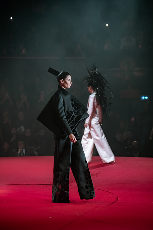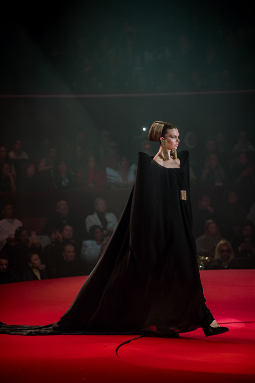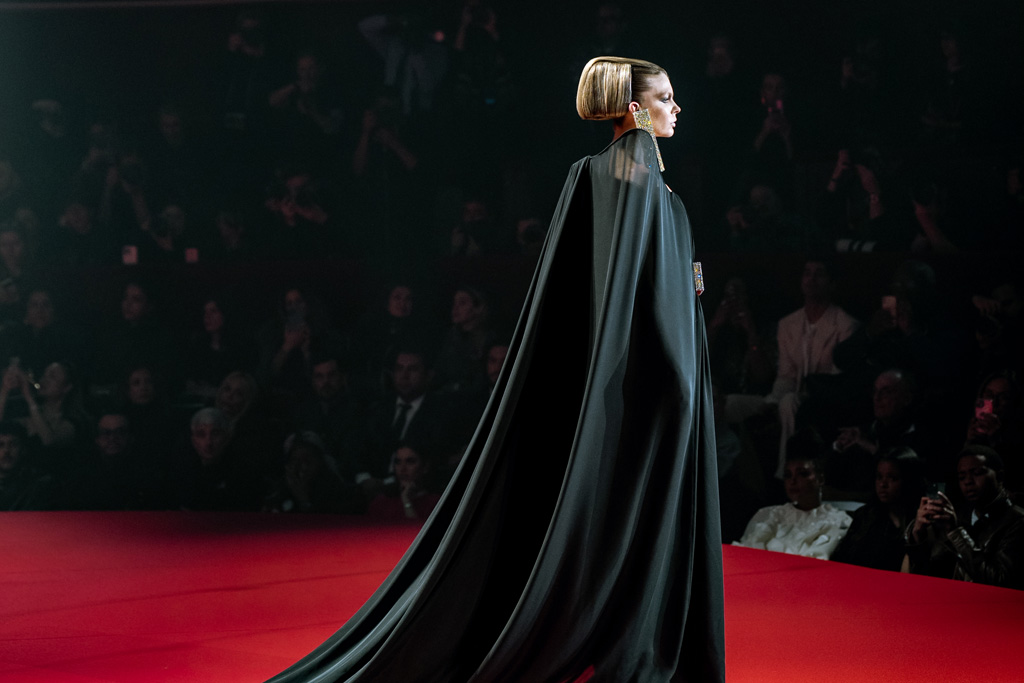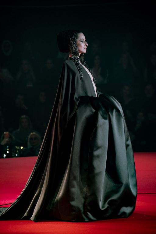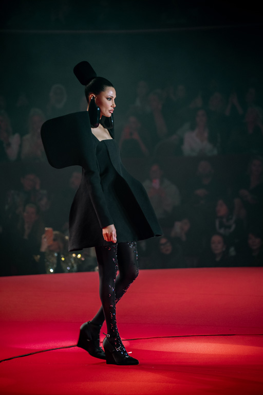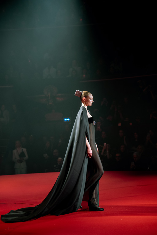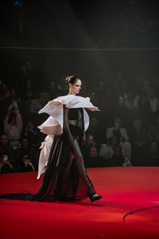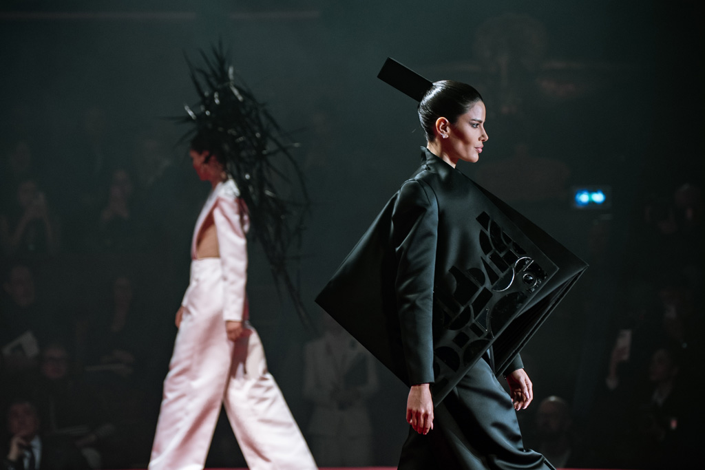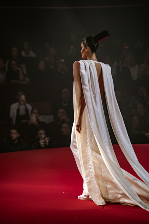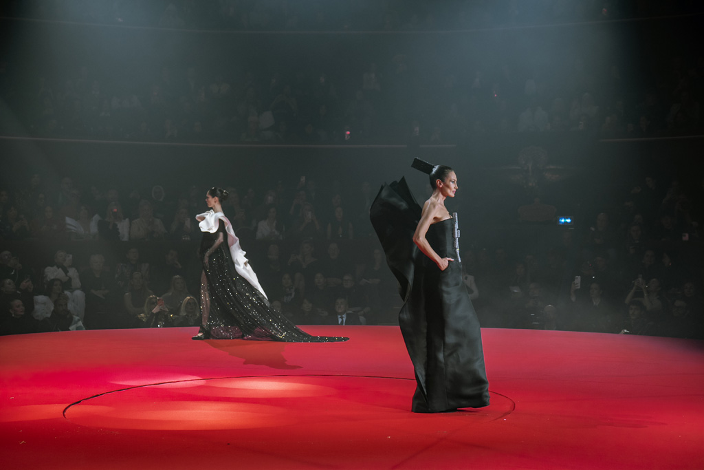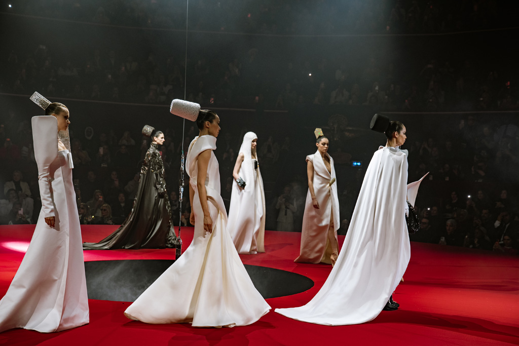Inspired by Pablo Picasso’s Cubist innovations and his connection to circus archetypes like the Auguste, Ringmaster, Pierrot, and solitary clown—as seen in the 1917 ballet Parade—the collection captures the circus as a temple of imagination and a factory of dreams. It features asymmetrical coats, structured capes, coat-dresses, voluminous balloon pants, jumpsuits, structured shorts, bustiers, and oversized coats in an architecture of silence, crafted from gazar, duchess satin, crepe, organza, chiffon, velvet, with black-white palettes accented by red, burgundy, and caramel tones, plus geometric sculptural forms, dramatic draping, plexiglass cube brooches set in diamonds, and gem embellishments that blur fashion and art. Launched during Paris Haute Couture Week (January 26-29, 2026), embroidery acts as a language using diamonds and crystals to convey light rather than wealth, while silhouettes subvert movement for red-carpet glamour, challenging boundaries with constant tension between body and material, fragility, and beauty.