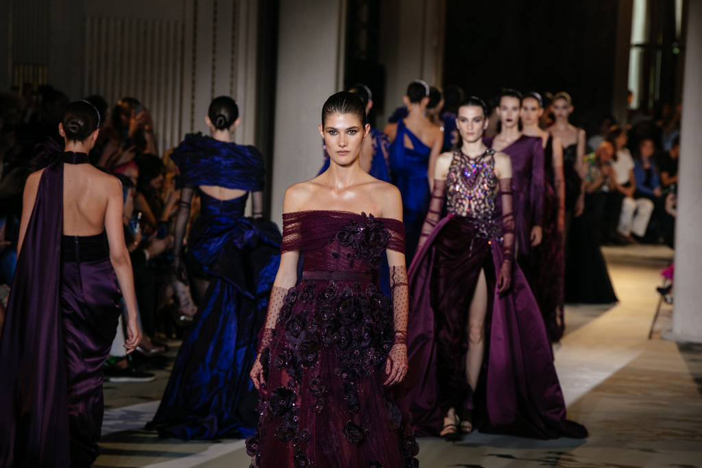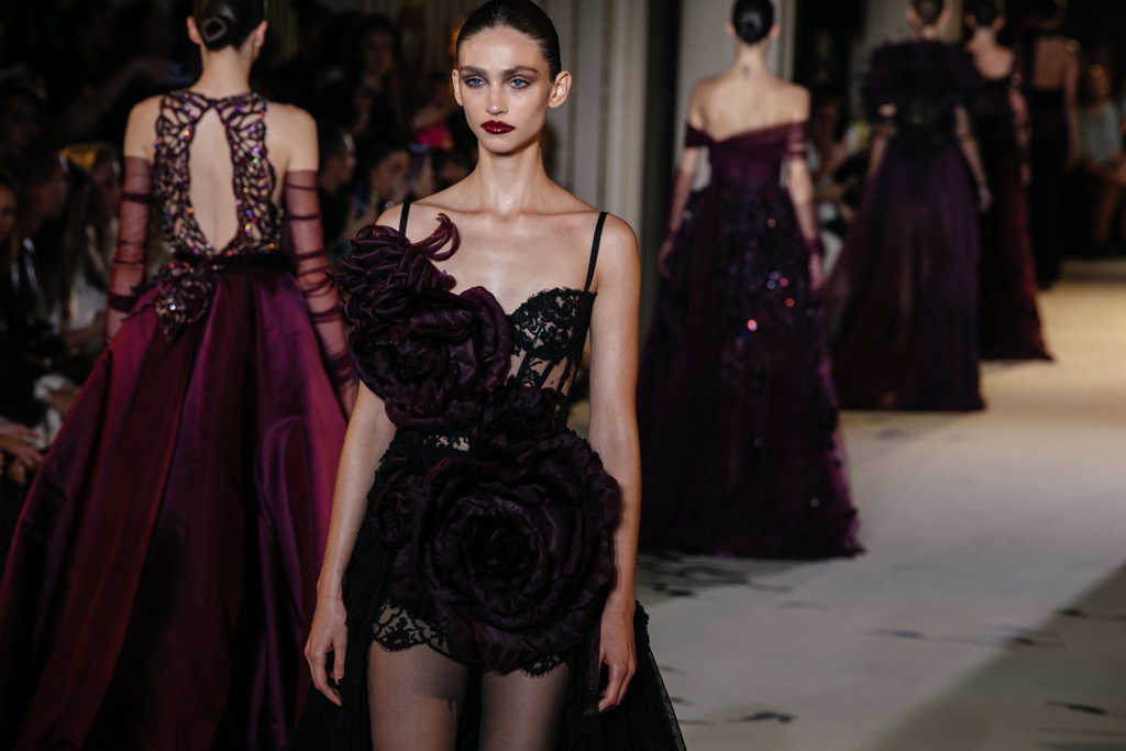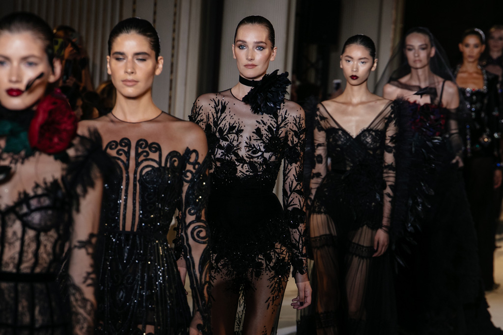 The Zuhair Murad collection exudes an aura of medieval opulence, blending whimsical gothic elements with a distinctly modern flair. The magnetic black color permeates every piece, exuding the very essence of seduction and endlessly captivating with its subdued illumination.